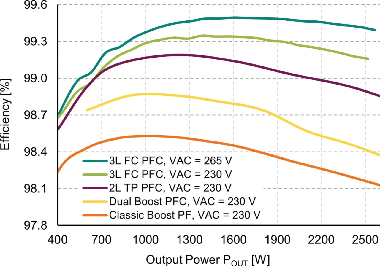 In den hier vorgestellten Ergebnissen wird nur eine der beiden Boost-Stufen verwendet, um einen Vergleich mit der üblichen 2L-Totem-Pole-PFC (650 V-SiC-MOSFET), klassischen und Dual-Boost-PFC (jeweils 650 CoolMOS) zu ermöglichen. Für den in Bild 4 dargestellten Effizienzvergleich verwendet die 3L-FC-TP-PFC CoolSiC-MOSFETs 400 V G2. Die 2L-TP-PFC verwendet CoolSiC MOSFETs 650 V G2, während die Dual-Boost-PFC CoolMOS P7 und die klassische Boost-PFC CoolMOS-CFD7A-Bauteile verwendet. Bei einer Eingangsspannung von 230 V übertrifft die 3L-FC-Toplogie den Wirkungsgrad der 2L-TP-PFC und nutzt dabei fast die 2,5-fache Schaltfrequenz, was eine höhere Leistungsdichte ermöglicht. Wie ein Blick auf den Wirkungsgrad bei 2,5 kW zeigt, ist der Unterschied beträchtlich: 99,15 Prozent gegenüber 98,9 Prozent. Dies führt zu über 25 Prozent weniger Verlusten bei der Leistungsumwandlung. Für den Anwender bedeutet das einen deutlich geringeren Kühlaufwand und macht die Topologie attraktiv für Rechenzentren und andere Anwendungen, bei denen Energieeffizienz eine wichtige Rolle spielt. Darüber hinaus verbessert sich der Spitzenwirkungsgrad von 99,19 Prozent bei der 2L-TP-PFC auf 99,35 Prozent bei der 3L-FC-Topolgie.