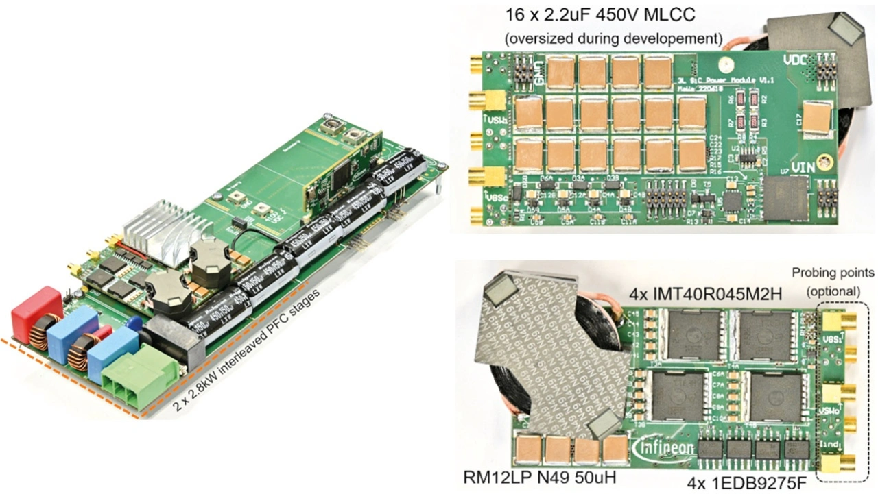 Für die 3L-FC-Topologie wurde ein Technologiedemonstrator mit einer Leistung von bis zu 5,6 kW entworfen (Bild 3). Auf der Vorderseite sind zwei phasenversetzte 3L-FC-Booststufen zu sehen. Im leeren Bereich im hinteren Teil bietet sich Platz für einen LLC-DC/DC-Wandler zur Abwärtswandlung auf 48 V. Da jede einzelne 3L-Booststufe auf Bauteilebene mit 80 kHz schaltet, beträgt die effektive Schaltfrequenz pro Phase 160 kHz. Um die effektive Schaltfrequenz zum EMV-Filter weiter zu erhöhen, werden die zwei Phasen versetzt betrieben, sodass die effektive Frequenz 320 kHz beträgt. Die Induktivität beträgt jeweils 50 µH, und um der höheren Frequenz Rechnung zu tragen, wird ein Ferritkern (RM12LP) mit Litzendraht verwendet. Zum Einsatz kommen 400-V-SiC-MOSFETs vom Typ IMT40R045M2H mit einem RDS(on) von 45 mΩ. Je nach Designziel lassen sich die Schaltfrequenz und die Größe der Induktivität weiter anpassen. Dadurch ist ein höherer Spitzenwirkungsgrad oder eine höhere Leistungsdichte erzielbar, beispielsweise durch Verwendung niederohmigerer MOSFETs und Betrieb bei 32,5 beziehungsweise 65 kHz pro Schalter (IMT40R015M2H mit 15 mΩ) oder durch den Betrieb des gesamten Systems weit über 400 kHz (>100 kHz pro Bauteil).