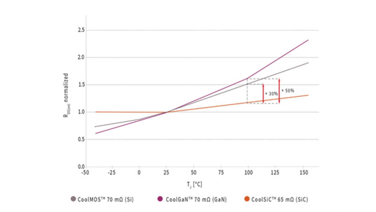 Ein wichtiges Merkmal des CoolSiC-MOSFET 650 V ist in Bild 2 zu sehen, das die normalisierte RDS(on)-Kurve in Abhängigkeit von der Sperrschichttemperatur für CoolMOS-, CoolGaN- und CoolSiC-Bauteile zeigt.