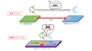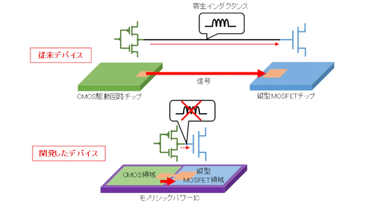 Das konzeptionelle Schema des monolithischen SiC-Leistungs-ICs zeigt Bild 1. Üblicherweise sind der CMOS-Treiber und der vertikale MOSFET auf separaten Chips untergebracht, und sind über Bonddrähte oder Leiterbahnen miteinander verschalten. Die parasitären Induktivitäten der Verdrahtung beeinträchtigen den Schaltvorgang und erhöhen die Verluste. Das monolithische Leistungs-IC minimiert die Länge der Signalverdrahtung und damit Größe und Gewicht von Umrichtern sowie die parasitäre Induktivität.