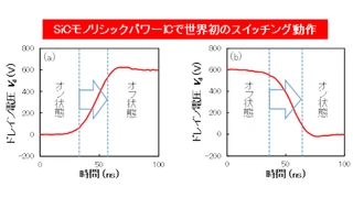 Die Schaltverläufe des monolithischen SiC-Leistungs-ICs sind in Bild 3 dargestellt. Der Schaltvorgang wurde bei einer Drain-Spannung von 600 V und einem Drain-Strom von 10 A durchgeführt.