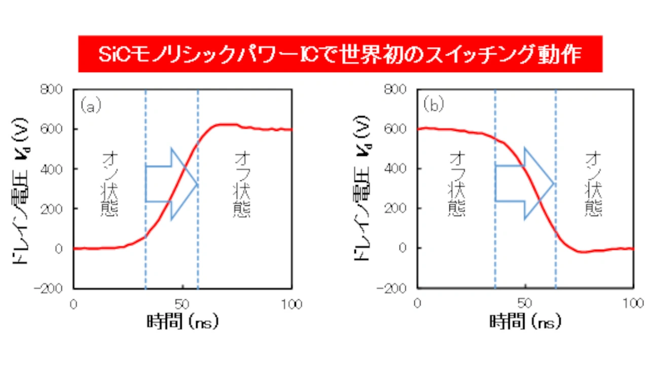 Die Schaltverläufe des monolithischen SiC-Leistungs-ICs sind in Bild 3 dargestellt. Der Schaltvorgang wurde bei einer Drain-Spannung von 600 V und einem Drain-Strom von 10 A durchgeführt.