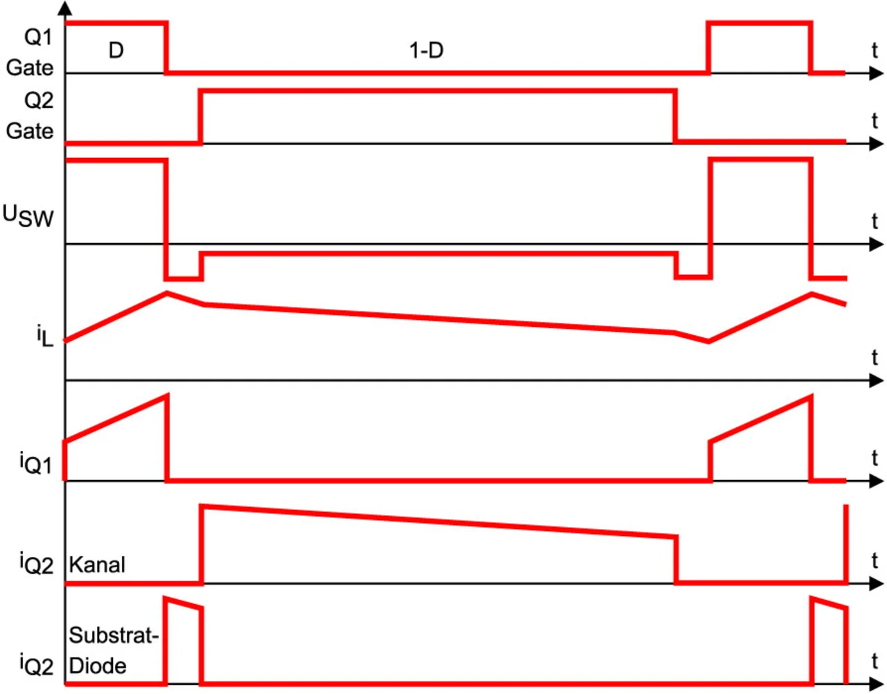 Die Analyse des Betriebsverhaltens eines synchronen Abwärtsreglers (Buck-Schaltregler) über einen vollständigen Schaltzyklus hinweg zeigt die unterschiedlichen Betriebsbedingungen auf, denen jeder MOSFET unterliegt (Bild 1). Bei eingeschaltetem Steuer-FET Q1 sperrt der Sync-FET Q2, und der Spulenstrom steigt an (Bild 2). Am Ende eines jeden Arbeitszyklusses schaltet Q1 ab, und Q2 bleibt zur Vermeidung von Brückenkurzschlüssen ebenfalls noch eine kurze Zeit im Sperrbetrieb. Das Steuer-IC des Reglers bestimmt die Länge dieser Sperrdauer, die auch als Totzeit bezeichnet wird und ungefähr 40 ns dauern kann.