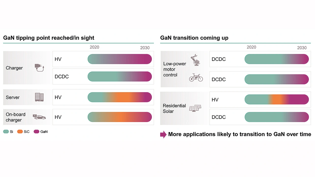 Auf einer Telefonkonferenz am 3. März 2023 zur geplanten Übernahme von GaN Systems meinte Adam White, Division President PSS bei Infineon, dass Siliziumkarbid (SiC) in den meisten Anwendungen im unteren zweistelligen Kilowatt-Bereich bis zum Ende dieses Jahrzehnts von Galliumnitrid (GaN) ersetzt würde (Bild 1). Damit würde Siliziumkarbid zur Brückentechnologie oder gar zum Auslaufmodell – zumindest für den Bereich unter etwa 10 bis 25 kW.
