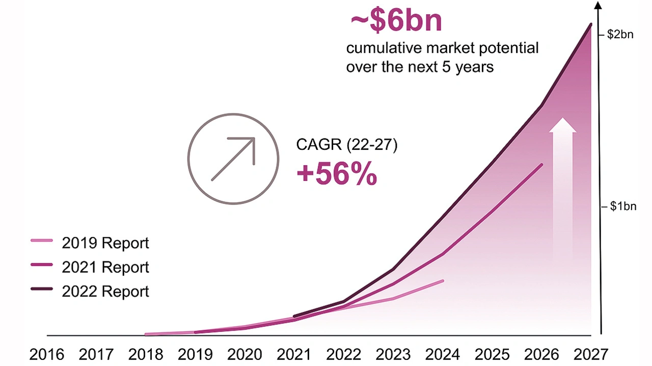 Wie sehr man sich allerdings verschätzen kann, musste Yole am eigenen Leib verspüren. In ihren jüngsten drei Jahresberichten zur Marktentwicklung bei GaN mussten sie die Prognosen jeweils drastisch nach oben korrigieren (Bild 3). Nach deren letzter Prognose soll dieses Segment bis 2027 nun mit jährlich 59 Prozent wachsen, von 126 Mio. Dollar im Jahr 2021 auf dann 2 Mrd. Dollar. Das kumulierte Marktpotenzial für die nächsten fünf Jahre soll bei 6 Mrd. Dollar liegen.