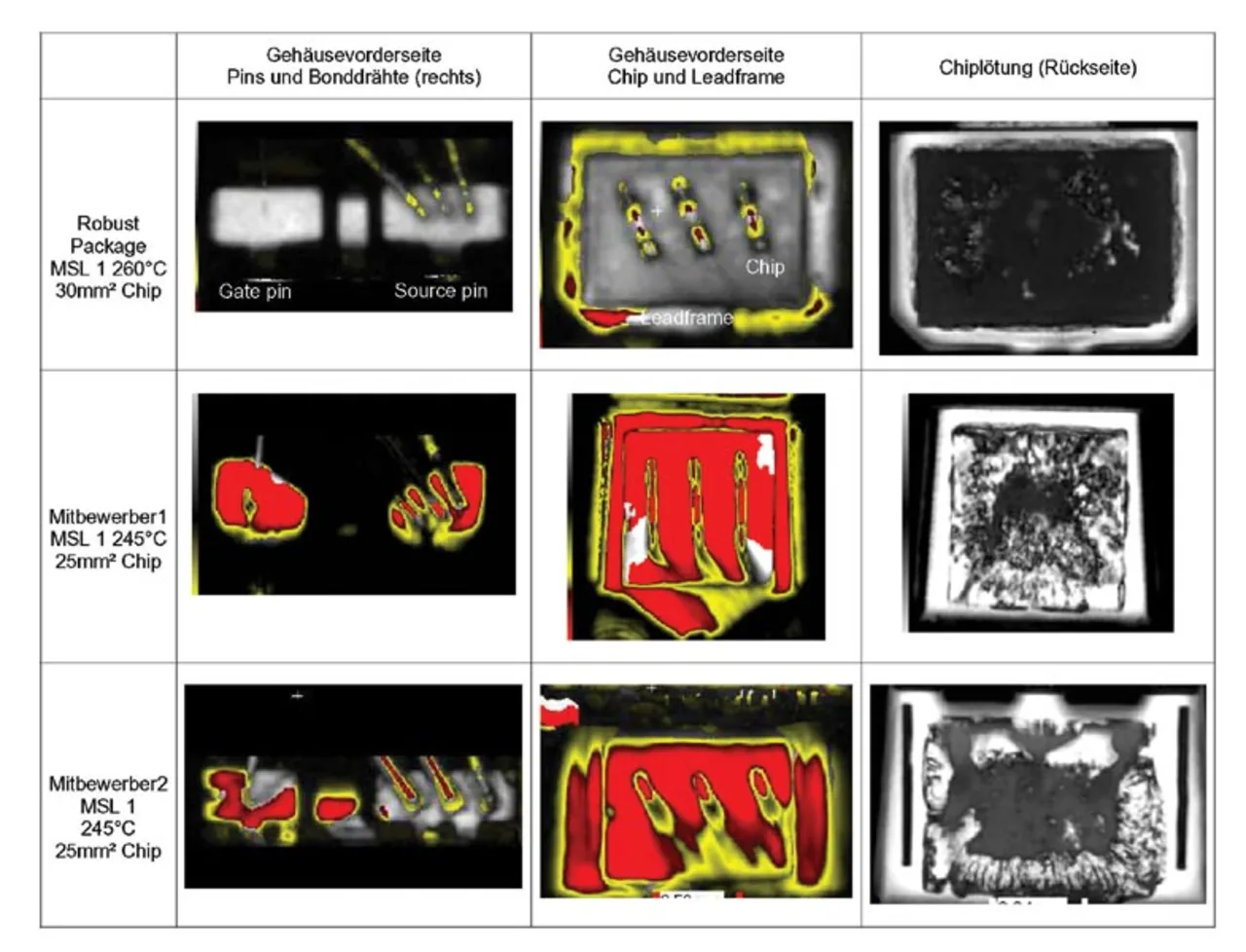 Beide Tests werden nach der Lagerung und 3-facher Reflow-Lötung-Simulation bis 260 °C (MSL 1 260 °C Preconditioning) durchgeführt. Um die Auswirkungen dieser Gehäuseänderungen in der Praxis zu beurteilen, wurden Vergleichstests zwischen dem Infineon-Robust-Package und marktgängigen Bauteilen durchgeführt. Als Gehäuse wurde ein D2PAK (P-TO263-3) verwendet. Beim Preconditioning der Mitbewerberprodukte wurde die 3-fache Lötsimulation nur bis 245 °C gefahren, weil diese Gehäuse nur bis 245 °C freigegeben sind. Dies bedeutet für diese Bauteile auch einen geringeren Lötstress. Solche Testergebnisse werden immer sowohl elektrisch als auch visuell ausgewertet. Dabei wurde auf beide erwähnten Hauptfehlermechanismen im Gehäuse fokussiert: Lotermüdung und Delamination der Pressmasse.