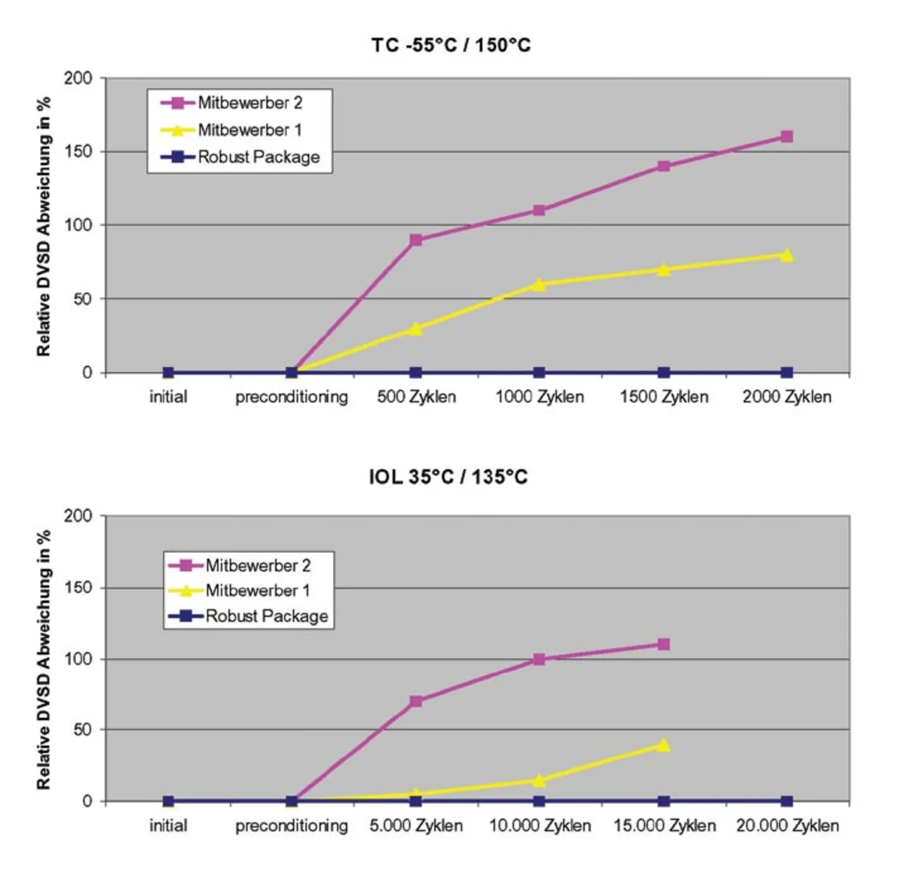 Das Robust-Package ist gemäß AEC Q101 qualifiziert. Für den durch Temperaturzyklen bedingten thermomechanischen Stress auf das Gehäuse gibt es innerhalb der AEC Q101 zwei Tests: