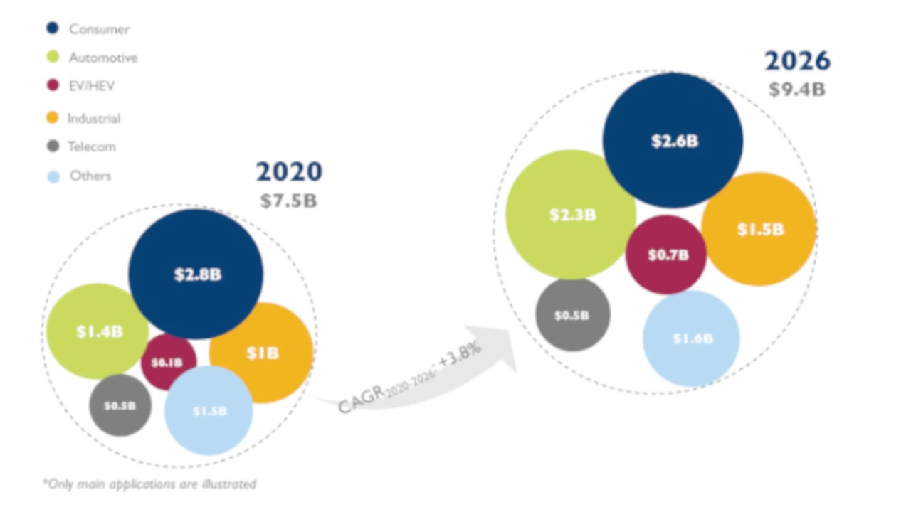 Den Bedarf an Silizium-MOSFETs ankurbeln dürfte die Automobilindustrie, einschließlich Elektrofahrzeuge, denn es werden immer mehr Nebenaggregate eingesetzt und die Elektrifizierung schreitet voran. Nebenaggregate steigern die Nachfrage nach Niederspannungs-MOSFETs, die Elektrifizierung die Nachfrage nach Hochspannungs-MOSFETs, die in DC-DC-Wandlern oder On-Board-Ladegeräten eingesetzt werden. Auf beide Segmente zusammen entfielen mit 1,4 Mrd. US-Dollar im Jahr 2020 etwa 21 Prozent des MOSFET-Marktes. Bis 2026 sollen diese Anteile auf 32 Prozent bzw. 2,3 Mrd. US-Dollar anwachsen.