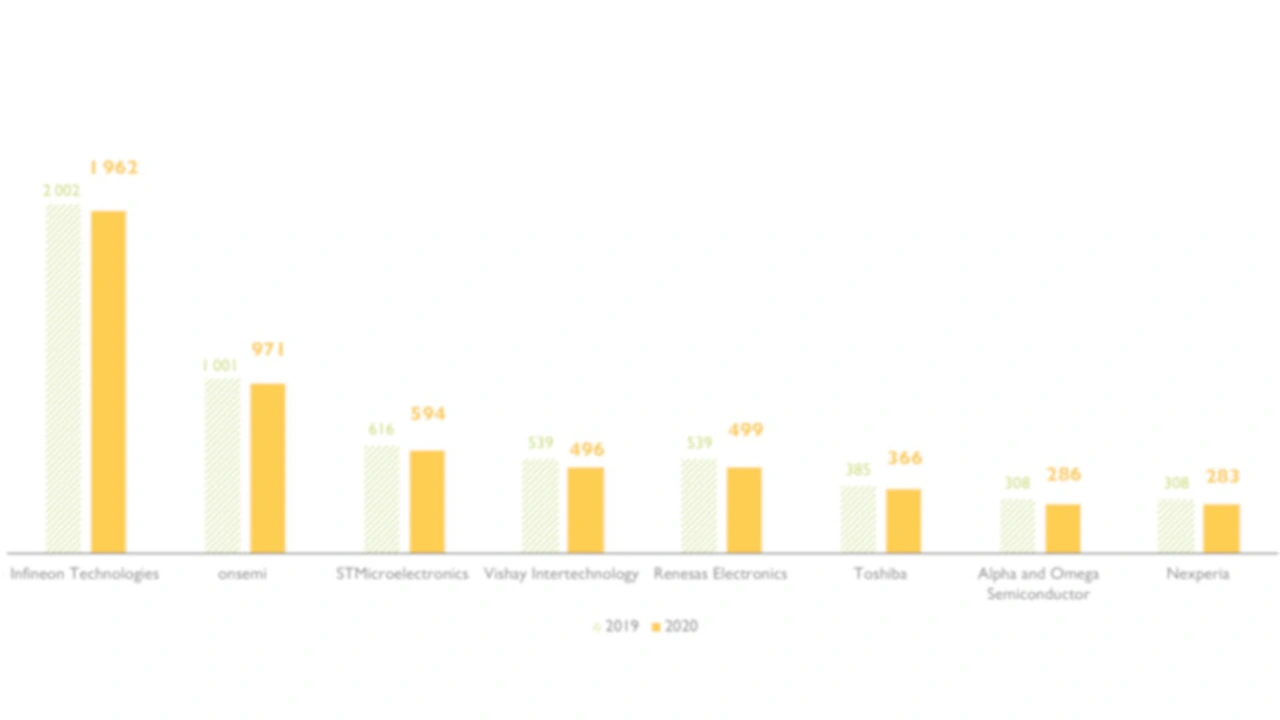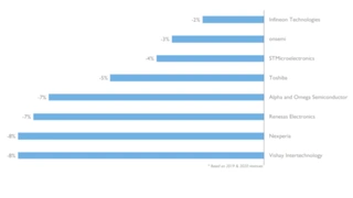 Infineon Technologies behauptet in diesem Marktsegment seine führende Position dank seines umfangreichen MOSFET-Portfolios und seiner CoolMOS-Technologie (Bild 2). Mit einem Marktanteil von 13 Prozent belegt onsemi den zweiten Platz und ist führend im Niederspannungssegment für Kraftfahrzeuge. Nichtsdestotrotz sanken die Umsätze der führenden Anbieter im Bereich Silizium-MOSFETs von 2019 auf 2020 (Bild 3). Warum das so ist, könnte zum Teil an den chinesischen Marktteilnehmern liegen.