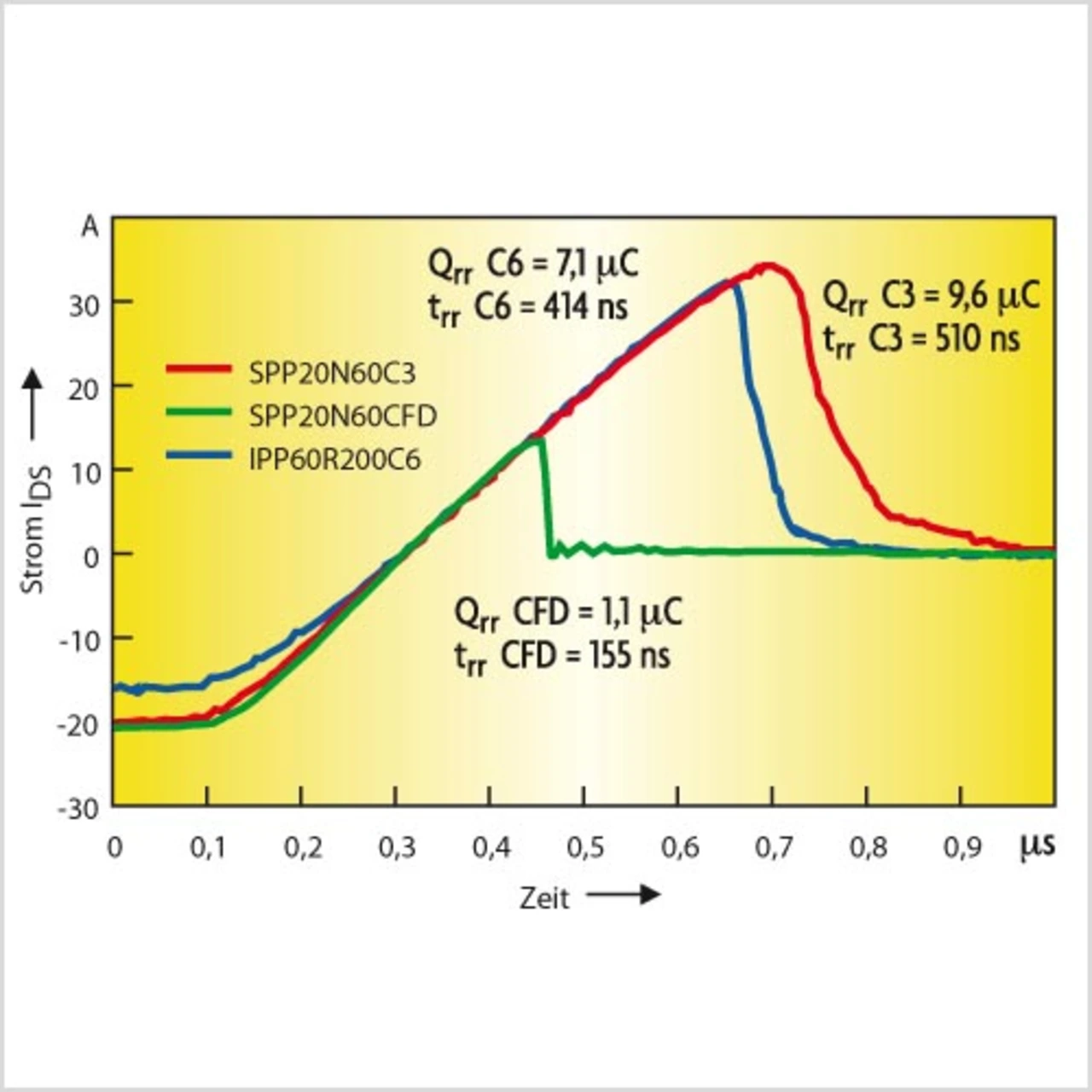 Ein weiteres wichtiges Kriterium für resonante Topologien ist das Überleben von Fehlerfällen wie der harten Kommutierung der leitenden Body-Diode. Solche Fälle können beispielsweise im LLC-Wandler in der Anlaufphase oder bei heftigen Lastsprüngen auftreten. Wie Bild 3 zeigt, ist die Speicherladung der Body-Diode beim CoolMOS C6 gegenüber der C3-Familie um etwa 25 % reduziert.