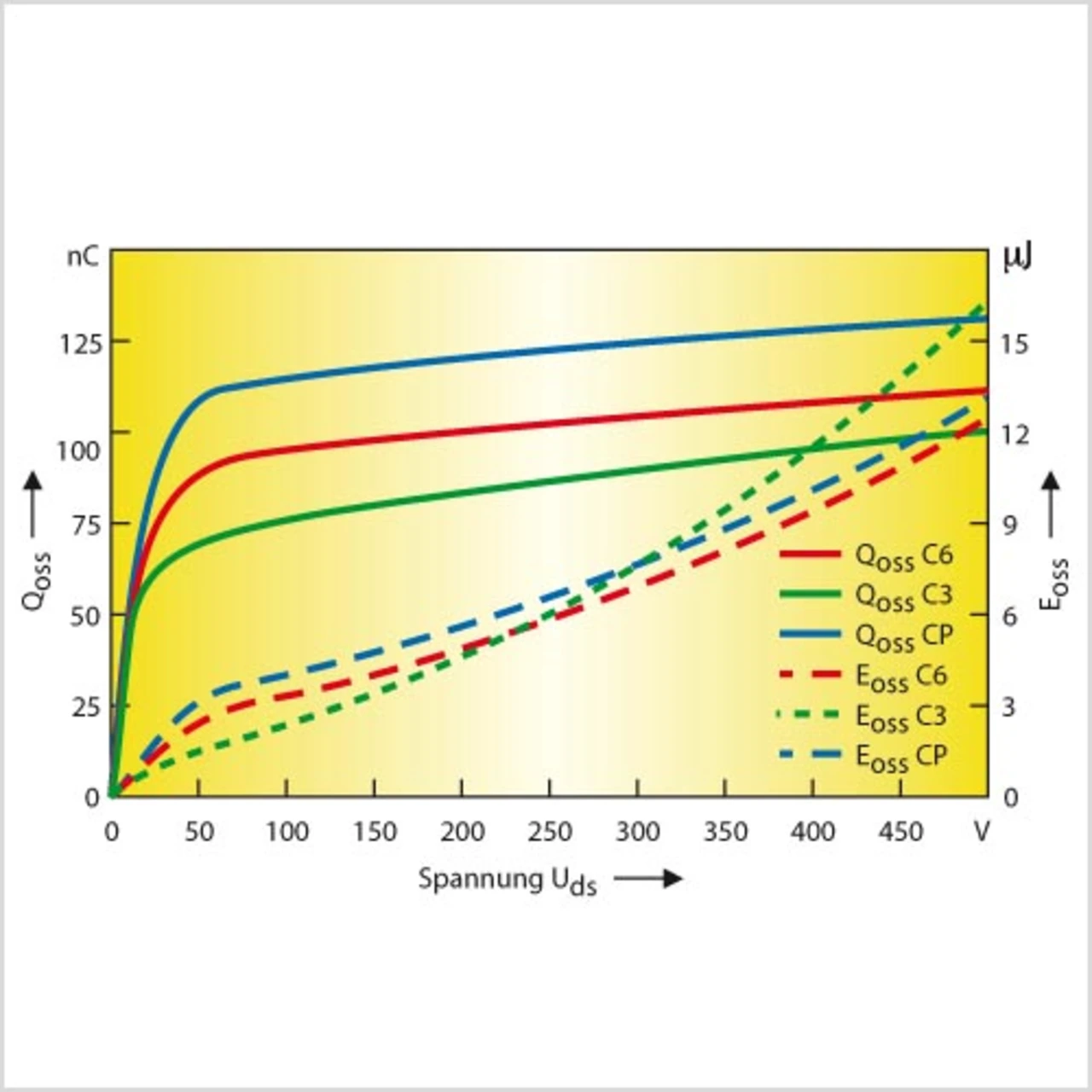 In der neuen Leistungshalbleiterfamilie CoolMOS C6 wird das Zusammenspiel aus Gate-Ladung, Übertragungssteilheit und internem verteiltem Gate-Widerstand so eingestellt, dass es selbst mit 0 Ω Gate-Widerstand zu keinen exzessiven Strom- oder Spannungssteilheiten kommt. Gleichzeitig bietet die Familie die besonders niedrigen flächenspezifischen Einschaltwiderstände der CP-Familie. Wie aus Bild 2 zu erkennen ist, wurde die in der Ausgangskapazität gespeicherte Energie Eoss sogar noch über das mit der CP-Familie erreichte Niveau verbessert. Die Energie Eoss wird beim Ausschalten in der Ausgangskapazität gespeichert und während des Einschaltens in Wärme umgewandelt. Sie trägt daher zu Verlusten bei.