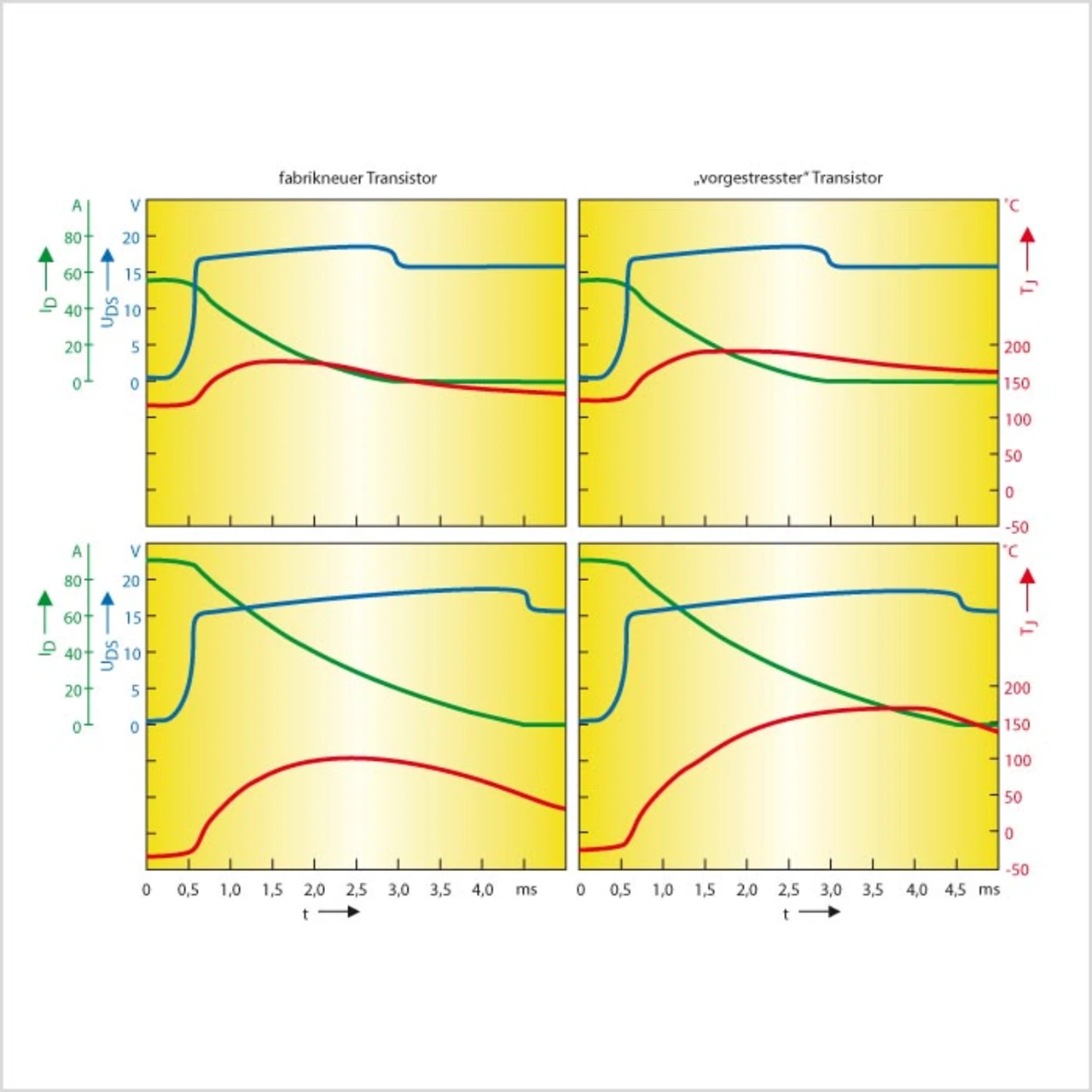 Bild 4 zeigt eine Vergleichsmessung zweier Transistoren gleichen Typs. Der eine ist fabrikneu, der nur dem Stress während des Lötprozesses ausgesetzt wurde. Der andere Transistor wurde zusätzlich noch mit 1000 Temperaturzyklen gestresst. Im Gegensatz zu Bild 3 wurde diesmal eine Last mit einem höheren Induktivitätswert verwendet. Des weiteren ist die Siliziumfläche der Transistoren größer.