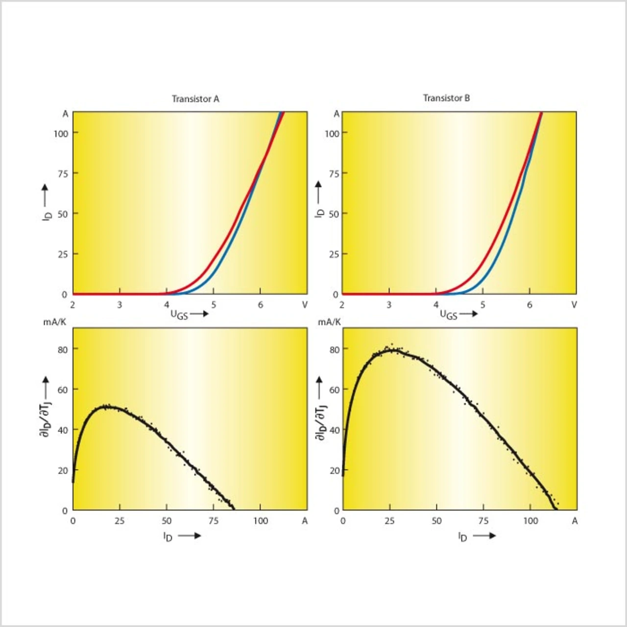 Mit zunehmender Zelldichte werden Power-FETs im Linearbereich immer empfindlicher. Eine Vergleichsmessung zwischen zwei Transistoren zeigt die Problematik auf. Beide Transistoren haben die gleiche Siliziumfläche, unterscheiden sich aber bezüglich der Siliziumtechnologie. Dies äußert sich in leicht unterschiedlichen elektrischen Eigenschaften. Die in Bild 2 dargestellten Transferkennlinien beider Transistoren, welche bei niedriger und hoher Temperatur vermessen wurden, weichen kaum voneinander ab. Prinzipiell ist zu sehen, dass der Drainstrom bis zum isothermen Punkt mit zunehmender Temperatur, aber gleichbleibender Gate-Source-Spannung zunimmt. Die ebenfalls aufgezeigte Temperaturdrift des Drainstroms gibt darüber qualitativ Auskunft. Trotz des kaum sichtbaren Unterschiedes in den Kennlinien hat Transistor B (in Bild 2 rechts) eine deutlich stärkere Drift. Folglich wird dieser Transistor eher dazu tendieren, sich im Linearbereich instabil zu verhalten. Dies äußert sich darin, dass sich so genannte „Hot Spots“ herausbilden.