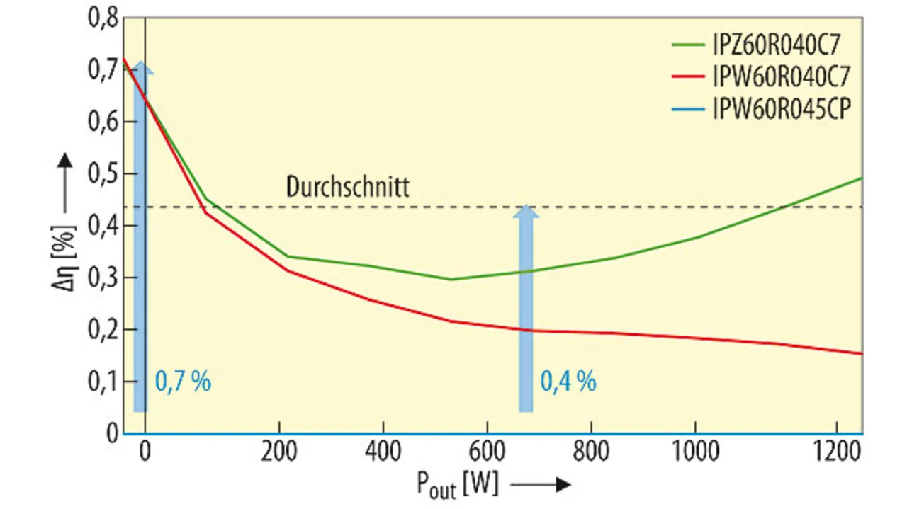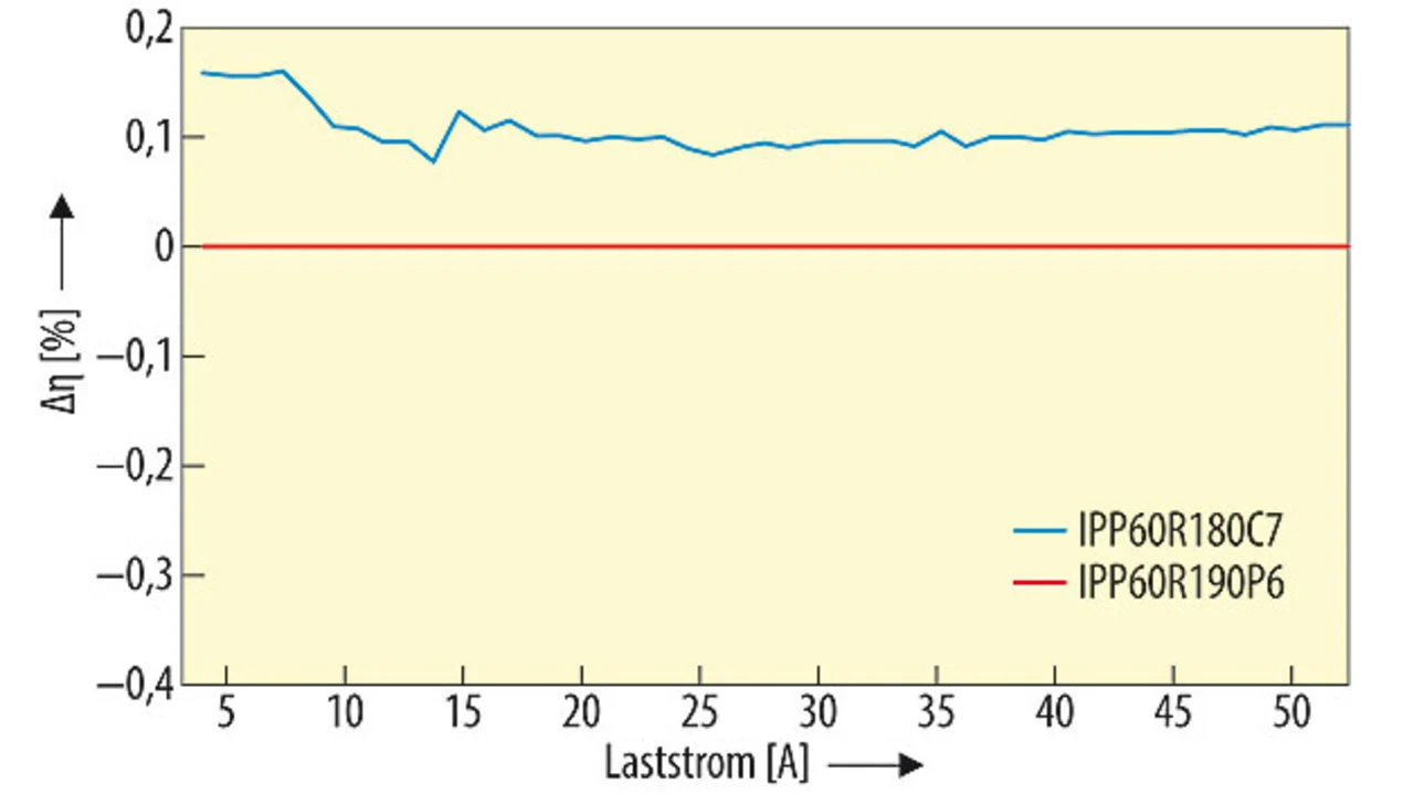 Wie bereits oben erwähnt, bieten die CoolMOS-C7-Bausteine (600 V) Vorteile in Applikationen, die durch Wirkungsgrad- und Kosten/BoM-Verbesserungen (Bill of Materials) getrieben sind. Bild 3 zeigt einen Vergleich des Wirkungsgrads von 600-V-C7-MOSFETs gegenüber Bausteinen aus der CoolMOS-CP-Familie in einem Schaltnetzteil mit Leistungsfaktorkorrektur und CCM-Betrieb (Continuous Current Mode; 65 kHz). Wie zu sehen ist, steigt mit C7-Bausteinen im TO-247-4-Pin-Gehäuse im Vergleich zu CoolMOS-CP-Komponenten der Wirkungsgrad bei geringer Last um 0,7 Prozent; über den gesamten Lastbereich zeigt sich im Durchschnitt ein um 0,4 Prozent verbesserter Wirkungsgrad. Der höhere Wirkungsgrad von Stromversorgungen führt aufgrund niedrigerer Energieverluste zu verringerten Betriebskosten. Ein Beispiel: Wird ein 2,5-kW-Schaltnetzteil für einen Server mit einer Durchschnittslast von 50 Prozent betrieben, führt die mit CoolMOS C7 erreichbare Verbesserung beim Wirkungsgrad zu insgesamt um 9 Prozent verringerten Energiekosten. Die damit einhergehenden geringeren thermischen Verluste führen zu einer höheren Bauteildichte, was sich in Einsparungen an Leiterplattenfläche widerspiegelt.