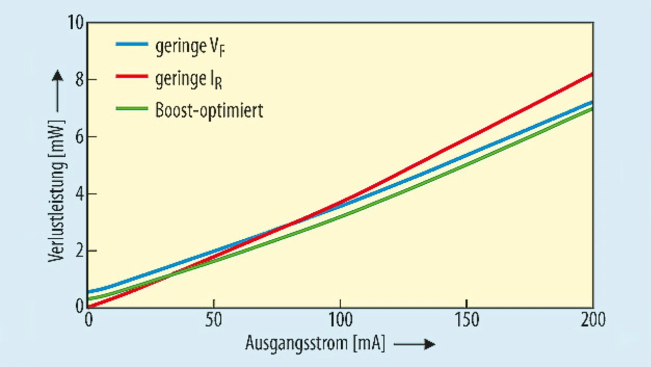 Betrachtet man die Verlustleistung in Abhängigkeit von Ausgangsströmen, dann zeigt sich auch dabei, wie wichtig die Auswahl einer Boost-optimierten Schottky-Diode ist.