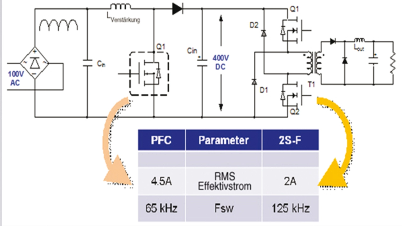 In jedem Schaltkreis gibt es zwei Arten von Schaltverlusten. Die erste entsteht beim Ein- und Ausschalten durch das Produkt aus UDS und IDS. Diese Verluste werden auf Qsw umgerechnet, eine Kombination aus QGD und QGS, und repräsentieren die effektive Schaltlast des MOSFET. Diese Art der Schaltverluste hängt sowohl vom Verbraucher als auch von der Schaltfrequenz ab. Der zweite Art Schaltverluste tritt durch das Laden und Entladen der Ausgangskapazität des MOSFETs Coss zusammen. Bei ATX-Netzteilen folgt der beliebte Halbbrücken-Durchflusswandler dem PFC-Wandler mit einer Eingangsspannung von etwa 400 V. Dadurch kann diese Art Schaltverluste einen wesentlichen Teil der Gesamtverluste ausmachen. Dies gilt vor allem bei geringen Lasten, bei denen die Schaltverluste die Leitungsverluste übersteigen. Dieser Verlust ist im Wesentlichen unabhängig von der Last, und sowohl Qoss als auch Qsw müssen bei der Auswahl des entsprechenden MOSFETs berücksichtigt werden. Eine auf Verlustbeiträgen basierende anwendungsspezifische Figure-of-Merit (FoM) wäre: Leitungsverluste (RDS(on)) + Schaltverluste_1 (Qsw) + Schaltverluste_2 (Qoss).