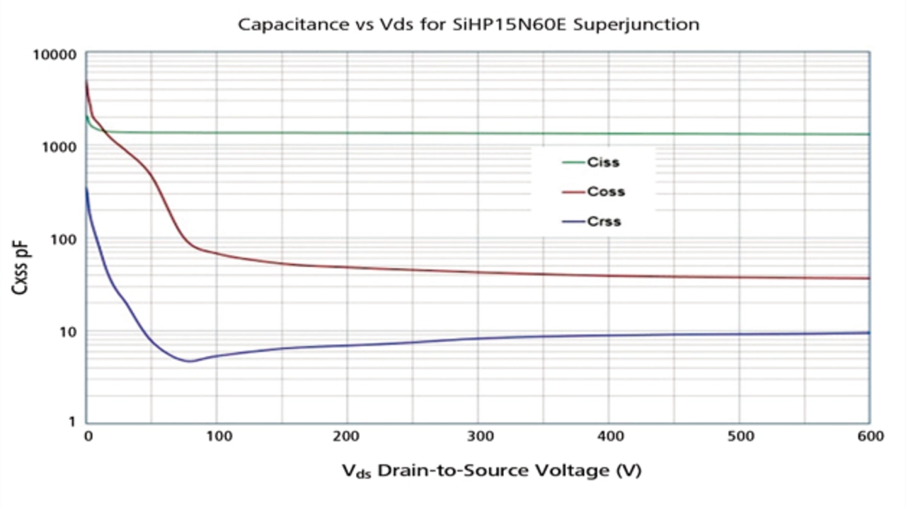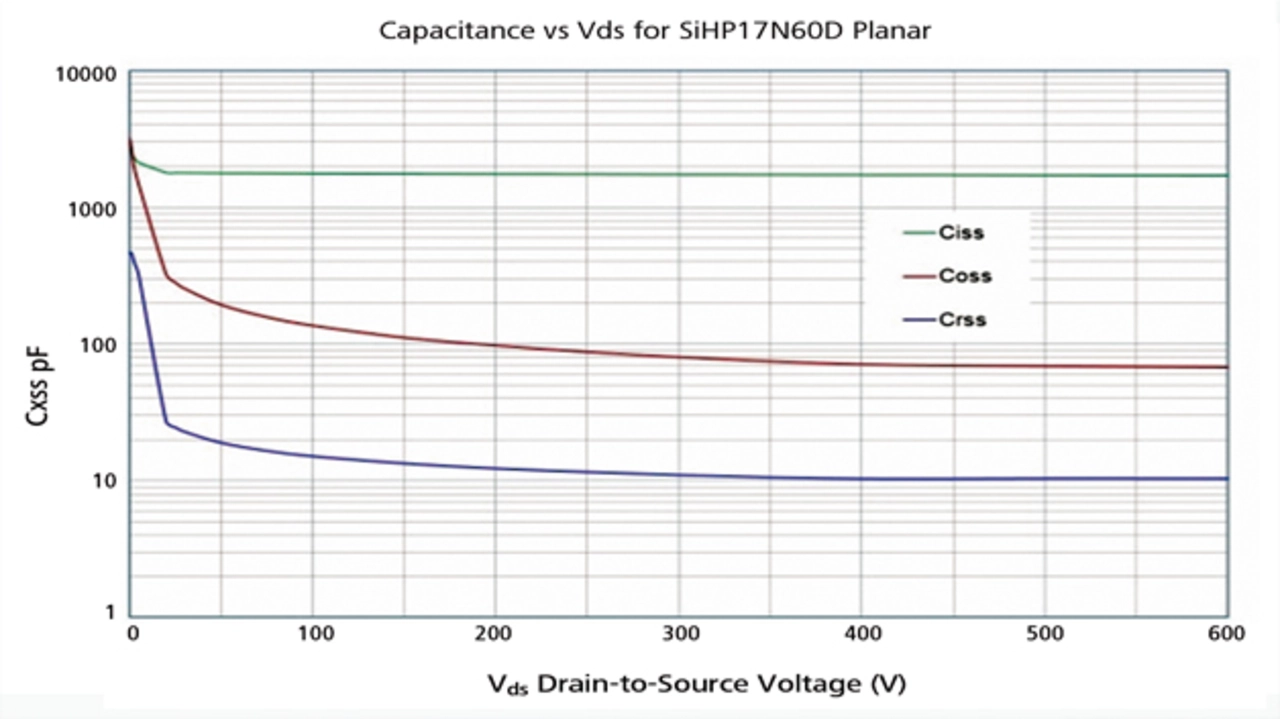 Die Coss eines Hochspannungs-MOSFETs variiert beträchtlich mit der angelegten Drain-Source-Spannung UDS. Diese Schwankungen sind bei Superjunction-MOSFETs viel größer als bei planaren Typen (Bild 3a und Bild 3b). Um die Nichtlinearität der parasitären Ausgangskapazität zu erklären, eignet sich folgende Näherungsgleichung: Poss = ½ ∙ Co(er) ∙ U² ∙ fsw. Die energiebezogene Kapazität Co(er) ist die effektive Kapazität, welche die gleiche gespeicherte Energie und die gleichen Verluste hat, wie die integrierte Coss des MOSFETs (0 V bis UDS) und ist in den Datenblättern angegeben. Es sei darauf hingewiesen, dass auf der parasitären Ausgangskapazität beruhende Verluste, die einen bedeutenden Teil der Gesamtverluste in jeder Hochspannungstopologie ausmachen, nicht in der Industriestandard-FoM (RDS(on) ∙ QG) berücksichtigt werden. Allerdings werden sie bei der anwendungsspezifischen Figure-of-Merit in dieser Analyse zur Bauteilauswahl integral verwendet.