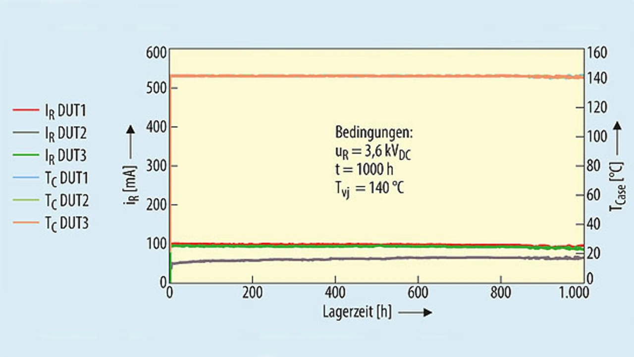 Die Sperrströme werden während der 1000-h-Lagerung bei Tvjmax aufgezeichnet und haben sich nicht verändert. Die Lagertemperatur wird auf 140 °C geregelt und auch erfasst. Die gute thermische Ankopplung der Randstruktur an den Mo-Träger verhindert zusätzlich ein thermisches Weglaufen des Sperrstromes trotz der hohen Temperatur.