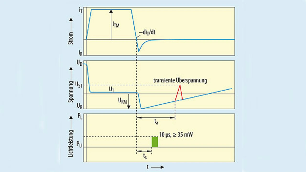 Der Ladungsträgerüberschuss im Vergleich zum Rest des Thyristors sorgt dafür, dass das Zünden genau an dieser Stelle und somit regelgerecht erfolgt [10]. Die integrierten Schutzfunktionen ermöglichen somit den Verzicht auf externe Schutzschaltungen, sodass Schaltungen mit LTTs einen deutlich geringeren Komplexitätsgrad haben als Schaltungen, die mit ETTs arbeiten.