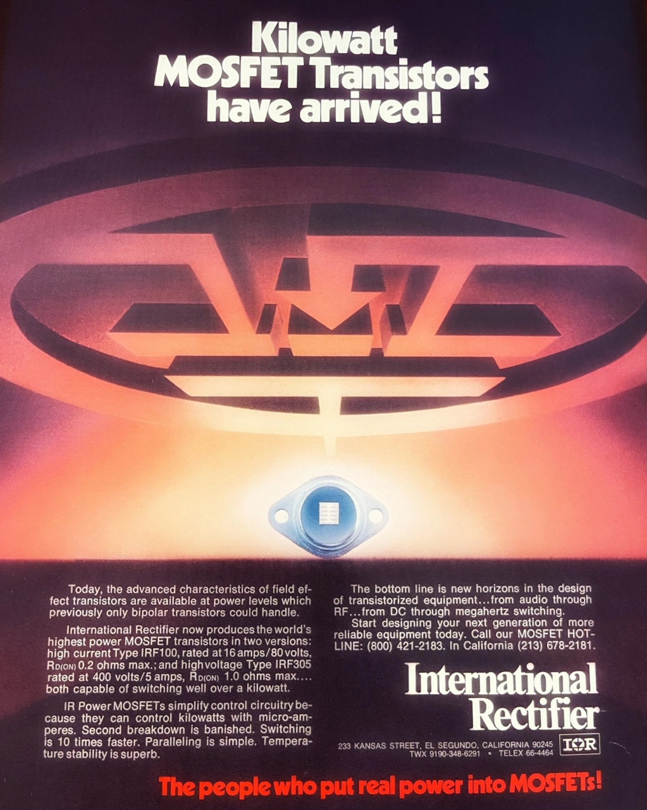 Richtig. MOS-Bauelemente besitzen ein Gate-Oxid zwischen dem Gate-Metall und dem darunter liegenden Kanal. Bipolare Sperrschichttransistoren haben dies nicht. Das war etwas völlig Neues auf dem Gebiet der Leistungstransistoren.
