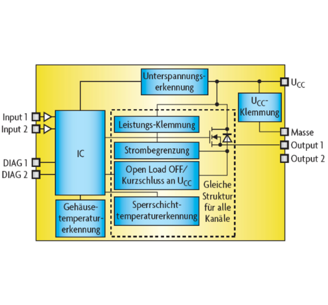 Das Blockschaltbild zeigt, dass jeder Kanal für sich umfassend geschützt ist (Bild 1). Im Chip integriert sind ein Schutz vor zu hohen Sperrschichttemperaturen – für jeden Kanal thermisch unabhängig –, eine Strombegrenzung (> 1 A; typisch 1,6 A bei 25 °C) sowie eine induktive Klemmung (typisch –50 V).