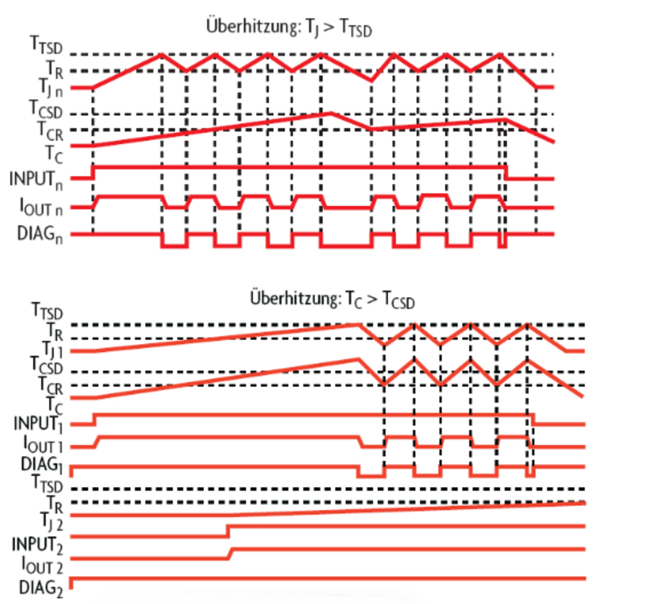 Bei einer Überlastung schaltet der betroffene Kanal selbsttätig ab und anschließend wieder ein, sodass die Sperrschicht- Temperatur des Kanals zwischen TTSD und TR (Sperrschicht- Rückstelltemperatur) pendelt.