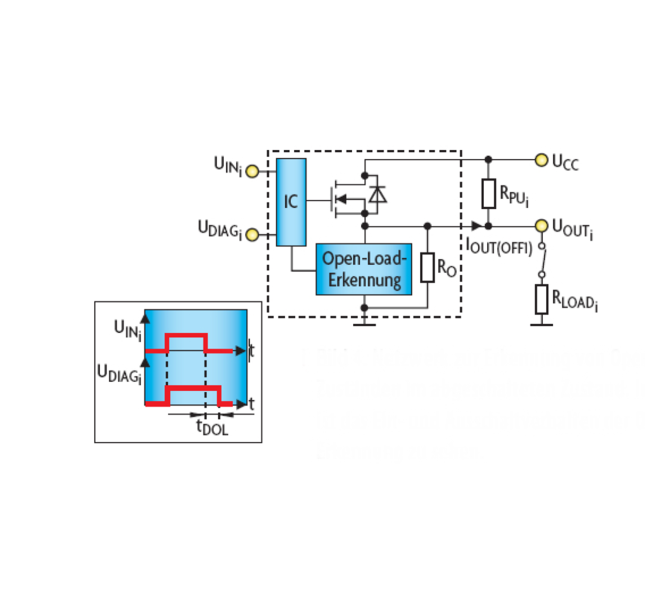 Damit ein Open-Load-Fehler im abgeschalteten Zustand erkannt werden kann, muss ein Pull-up-Widerstand zwischen UCC und Ausgang geschaltet werden (Bild 3).