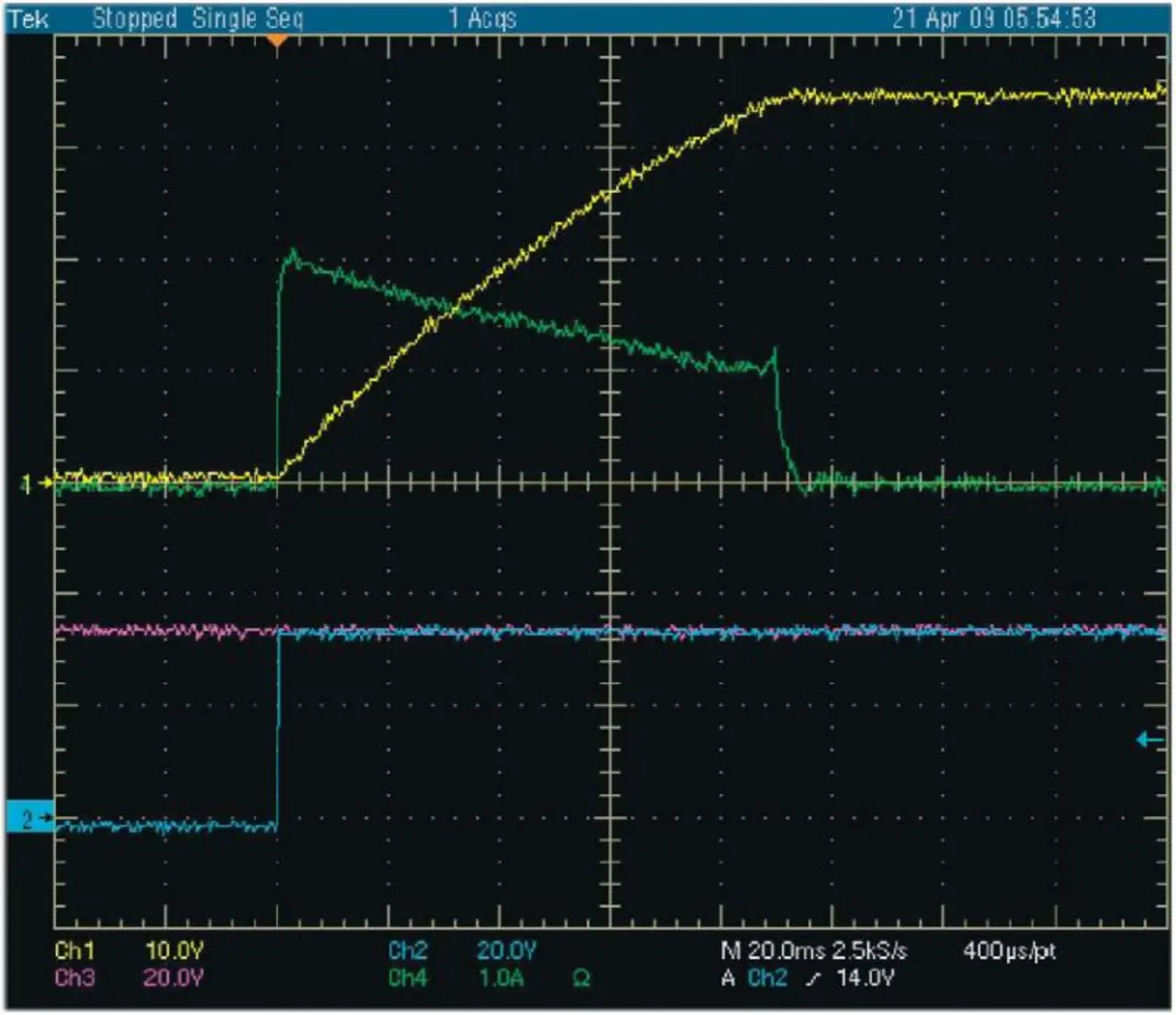 Wird die Lastkapazität weiter erhöht, lässt der Ladestrom die Strombegrenzung schließlich so lange ansprechen, bis der Überhitzungsschutz wirksam wird, wodurch der Ausgang auf die gleiche Weise deaktiviert wird wie durch den Überlastoder Kurzschlussschutz.