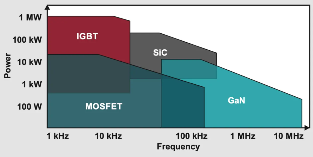 An sich ist Galliumnitrid (GaN) ein besserer Halbleiter als Si oder SiC und die Grafik zeigt, dass es – theoretisch – für höhere Geschwindigkeiten als SiC geeignet ist. Es weist eine geringere Kapazität auf, kann schneller schalten und hat keine Body-Diode. Es gestaltet sich jedoch schwierig in der Anwendung und hat den Ruf, brüchig zu sein.