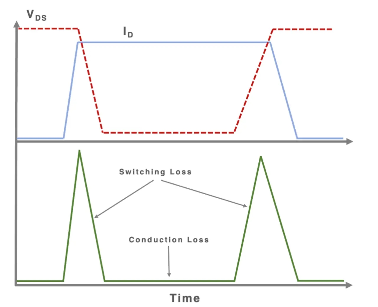 Das Diagramm zeigt die Anstiegs- und Abfallzeiten (Tr und Tf, bei denen Energie im Übergangsbereich verschwendet wird), die durch die ansteigenden und abfallenden Flanken dargestellt werden. Höhere Frequenzen bedeuten, dass diese Flanken fast senkrecht verlaufen, weshalb die Zeit in der Übergangsregion kürzer wird (unter einer Nanosekunde) und damit auch die Energieverschwendung.