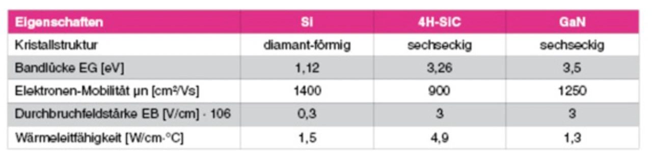 WBG-Materialien weisen zwischen dem Valenz- und dem Leitungsband eine breitere Lücke auf als Silizium. Siliziumkarbid (SiC) und Galliumnitrid (GaN) sind heute die am häufigsten eingesetzten WBG-Werkstoffe. Der Tabelle 1 sind die wichtigsten Eigenschaften von WBG- und Si-basierten Materialien zu entnehmen.