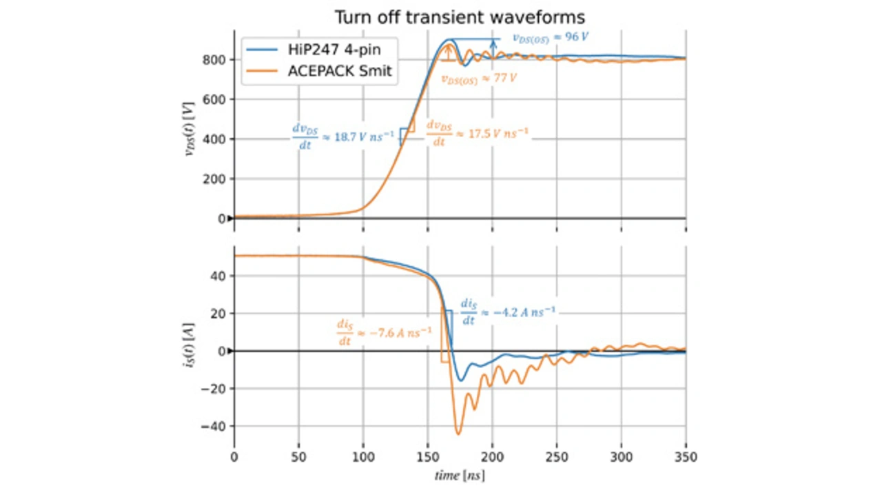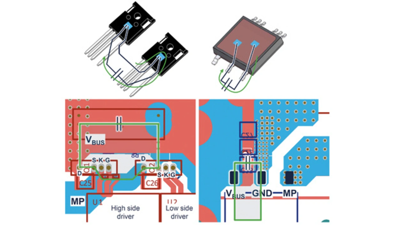 Bild 6 zeigt den Vergleich der Ausschaltwellenformen desselben Bauelements in verschiedenen Gehäusen. Die Testbedingungen sind dieselben: 50 A/800 V und gleicher Gate-Widerstand. Es zeigt sich, dass der Baustein im Acepack SMIT eine 80 Prozent schnellere dI/dt-Transiente ermöglicht. In jedem Fall ist die Überspannungsspitze bei Acepack SMIT fast gleich oder sogar weniger stark ausgeprägt. Wie ist das möglich? Offensichtlich besteht der Vorteil des Acepack-SMIT-Gehäuses in der Realisierung sehr kompakter Kommutierungsschleifen und folglich in der Minimierung von Streuinduktivitäten. Bild 7 sind die Unterschiede im Layout und die Größe der Kommutierungsschleifen zu entnehmen. Die typischerweise bei SiC-MOSFETs begrenzte maximale Einschwingdauer manifestiert sich im Überschwingen nach dem Ausschalten. Es handelt sich dabei um den Spannungsabfall über der parasitären Induktivität in der Kommutierungsschleife, multipliziert mit dI/dt. Da das Acepack-SMIT-Layout sehr kompakt und die Streuinduktivität am Ende gering ist, ermöglicht dieses Bauelement eine höhere Schaltgeschwindigkeit und geringere Schaltverluste. Im Layout-Beispiel kann man sehen, dass sich der Keramikkondensator direkt an die Pins des Acepack SMIT anschließen lässt. Dadurch wird der gesamte Leiterbahnabstand, einschließlich der Gehäusebeine und des internen Bondings, verkürzt und folglich die Streuinduktivität reduziert. Es ist höchstwahrscheinlich unmöglich, dieselbe Vereinfachung des Layouts mit herkömmlichen Gehäusen zu erreichen. Zu diesem Vorteil des Acepack SMIT gesellen sich weitere: die einfache Montage (SMD-Gehäuse) und die Vereinfachung der Kühlkörperimplementierung dank der integrierten Isolierung.