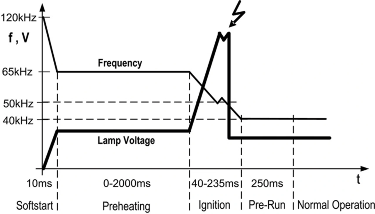 Der Wechselrichter startet mit einer Betriebsfrequenz von 120 kHz (Bild 3). Innerhalb von 10 ms verändert sich die Frequenz in 16 Schritten auf die mit dem Widerstand R22 einstellbare Vorheizfrequenz. Dort verweilt die Betriebsfrequenz des Wechselrichters für die Dauer der mit Widerstand R23 zwischen Null und 2000 ms einstellbaren Vorheizzeit. Anschließend ändert sich die Betriebsfrequenz in 128 Schritten und in einer Zeitspanne von 40 ms von der Vorheizfrequenz auf die mit dem Widerstand R21 einstellbare Nennfrequenz.