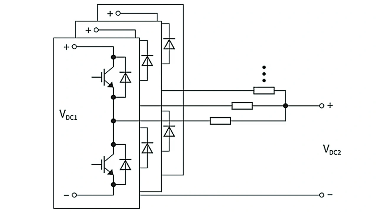 Die Gewinnung von Wasserstoff mithilfe von Gleichstromquellen wie Photovoltaik und batteriegestützten Hybridsystemen erfordert DC-DC-Wandler. Ein Abwärtswandler verwendet parallel geschaltete Halbbrücken-Chopper-Module, um den Gleichstrompegel vom Eingang zum Ausgang zu verändern (Bild 6). Mit der richtigen Interleave-Steuerung reduziert diese DC-DC-Wandlertopologie die DC-Welligkeit erheblich, ohne die Größe der Induktivitäten oder die Schaltfrequenz zu erhöhen. Jede Phase der Implementierung kann mit einem entsprechenden Modul realisiert werden. Das FF800R12KE7HPSA1 ist ein 62-mm-Halbbrücken-IGBT-Modul, das sich für DC-DC-Wandler mit abwärtswandelnder Topologie eignet. Er ist für maximal 1200 V ausgelegt und unterstützt einen maximalen Kollektorstrom von 800 A.