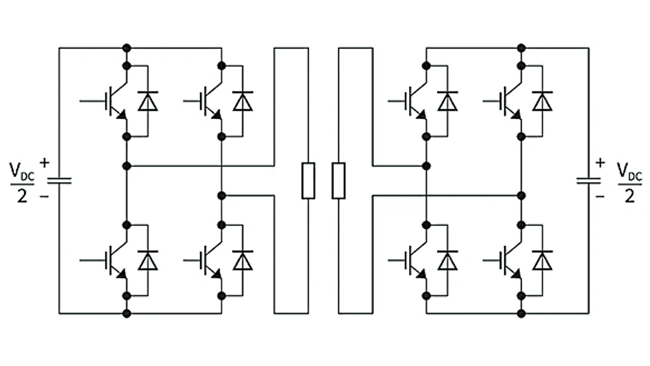 Der DAB-Wandler (Dual Active Bridge) ist eine Alternative zum Abwärtswandler (Bild 7). Er verwendet einen Hochfrequenztransformator zur Kopplung der Eingangs- und Ausgangs-Vollbrückenschaltungen, um eine galvanische Trennung zu gewährleisten. Eine solche Isolierung ist oft hilfreich, um die Korrosion des Tanks und der Elektroden der Elektrolysezelle zu minimieren. Identische Vollbrückenschaltungen werden mit komplementären Rechtecksignalen angesteuert. Die Phasenlage der Ansteuersignale zwischen der Primärseite und der Sekundärseite bestimmt die Richtung des Leistungsflusses. Darüber hinaus minimiert der DAB-Wandler die Schaltverluste, indem er die IGBTs im Null-Volt-Modus schaltet. Die Schaltung kann mit Halbbrücken-IGBT- oder Siliziumkarbid(SiC)-MOSFET-Modulen aufgebaut werden.