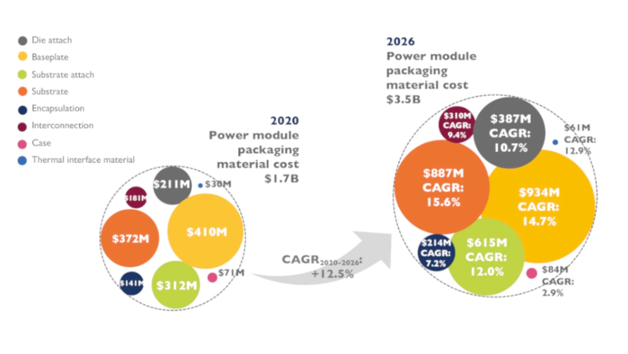 »Im Jahr 2020 stellten industrielle Antriebe mit 1,6 Milliarden US-Dollar den bedeutendsten Markt für Power-Module dar«, erklärte Dr. Shalu Agarwal, Power Electronics & Materials Analyst bei Yole Développement. »Bis 2026 werden jedoch Elektro- und Hybridfahrzeuge mit einem Umsatz von fast 3,6 Milliarden US-Dollar der bedeutendste Markt sein, wobei der Markt bis dahin jährlich um 10,5 Prozent wachsen dürfte. Stärker – nämlich um jährlich 12,5 Prozent – dürfte der Markt für Ausgangsmaterialien für das Packaging von Power-Modulen wachsen und könnte bis 2026 ein Marktvolumen von 3,5 Milliarden US-Dollar erreichen.«