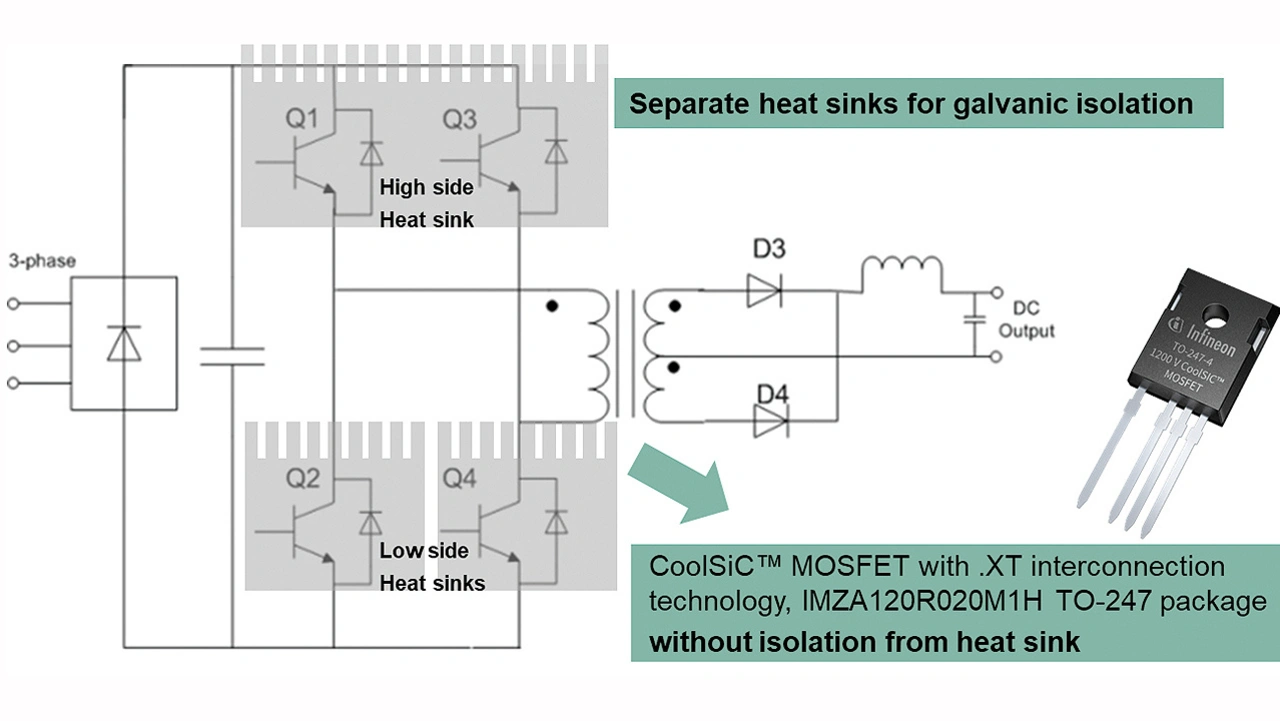 Um die Kühlung und Zuverlässigkeit der Bauelemente zu verbessern, schlägt Infineon den Einsatz der CoolSiC-MOSFETs für 1200 V im TO-247-Gehäuse mit der .XT-Verbindungstechnologie für das Packaging vor. Außerdem kommt ein spezielles Kühlungsdesign zum Einsatz, bei dem die diskreten Bauelemente ohne elektrische Isolierung direkt auf den Kühlkörper montiert werden, um die Wärmeableitung zu erhöhen [2] (Bild 1). Durch den höheren Wirkungsgrad und die höhere Leistungsdichte lassen sich die Ausgangsleistungen steigern und die Kosten für Schweißgeräte mittlerer Leistung senken.