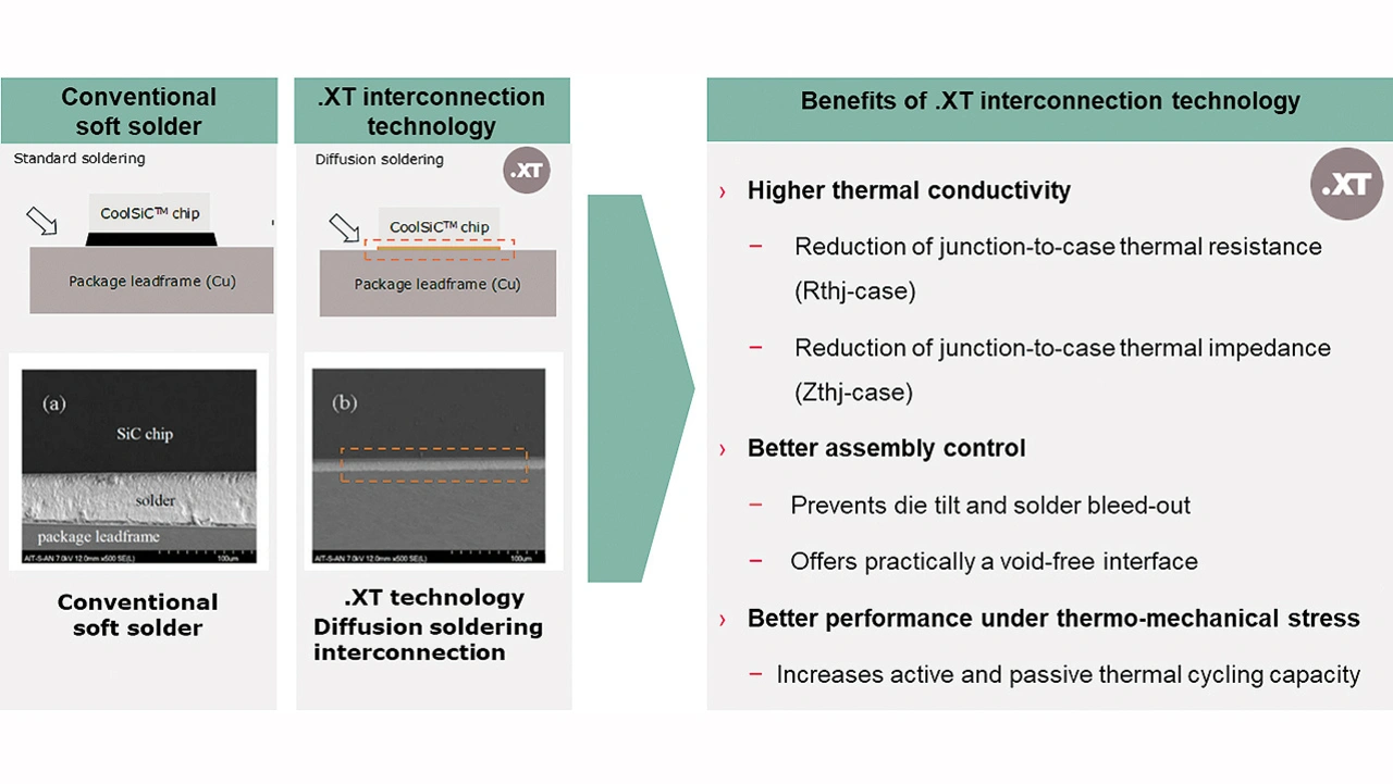 Auch wird das Bauteil zuverlässiger, da die .XT-Technologie verhindert, dass sich der Chip während des Die-Attach-Prozesses schrägstellt und Lötzinn seitlich ausläuft. Der Chip wird quasi hohlraumfrei mit dem Lötrahmen (Lead Frame) verbunden. Ebenso steigt die Temperaturzyklenfestigkeit bei aktiven und passiven Temperaturwechselprüfungen.