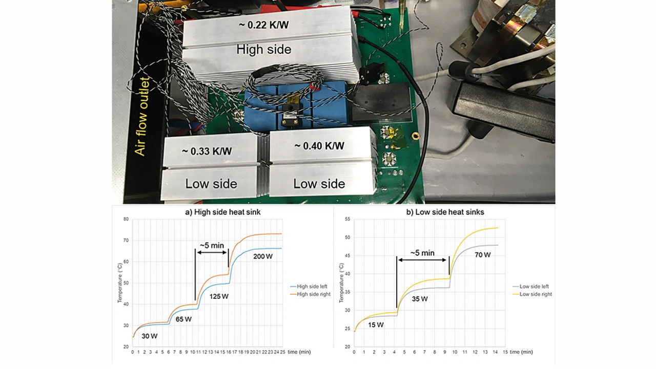 Um die in Tabelle 1 aufgeführten Anforderungen zu erfüllen, wurden der Kühlkörper und der Luftstrom so ausgelegt, dass die thermische Zeitkonstante realistisch ist. Alle Kühlkörper erreichten den thermischen Gleichgewichtszustand in etwa fünf Minuten (Bild 3).