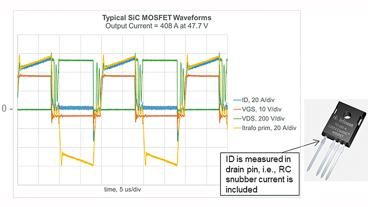 Wie erwartet, gab es aufgrund des passenden Gate-Treibers, des RC-Snubbers und des PCB-Layouts keinen signifikanten Unterschied zwischen dem CoolSiC-MOSFET von Infineon und dem SiC-MOSFET des Wettbewerbers, die beide ein ähnliches Signalverhalten aufwiesen (Bild 4).