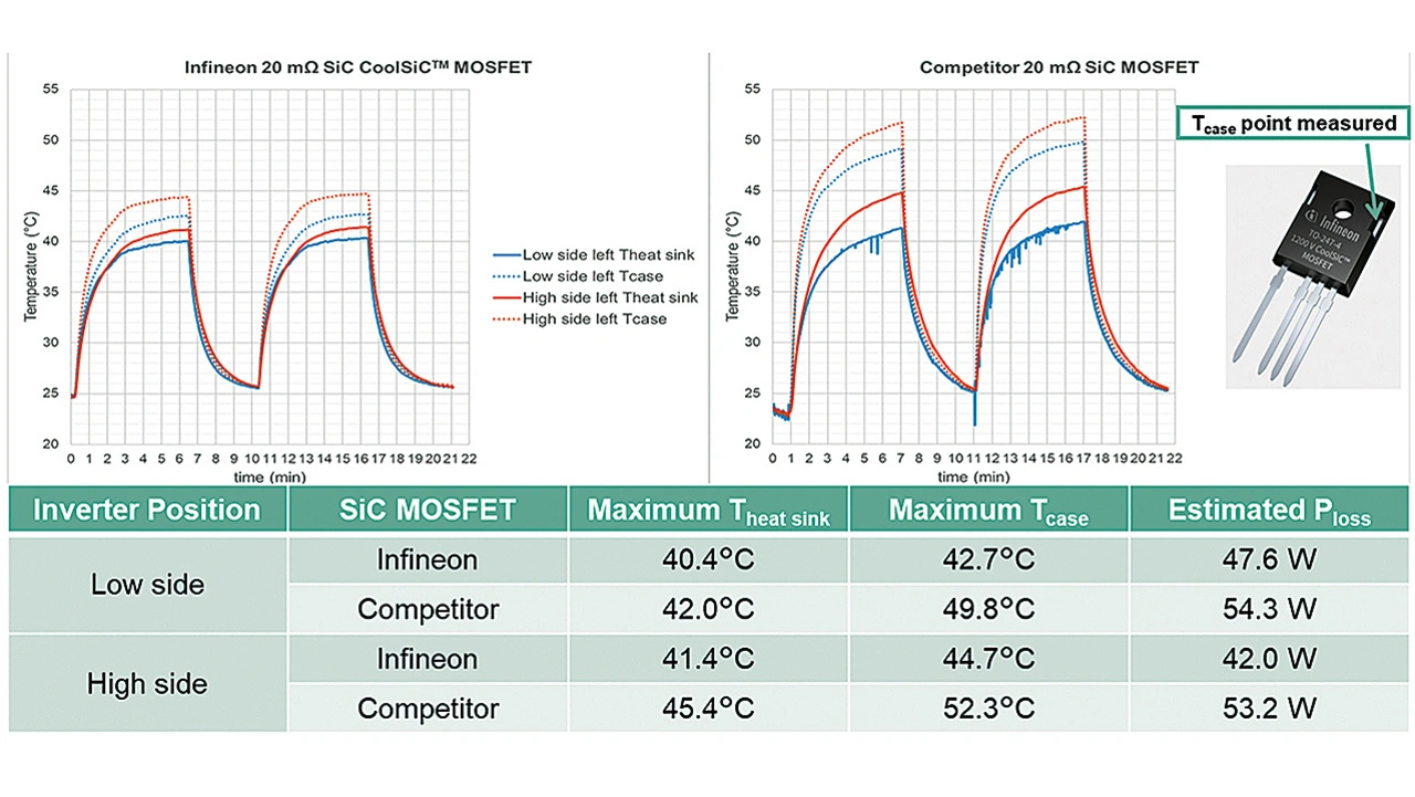 Im Durchschnitt wies der CoolSiC-MOSFET eine um sechs Prozent niedrigere Kühlkörpertemperatur, 17 Prozent geringere Leistungsverluste und eine um 14 Prozent niedrigere Gehäusetemperatur auf als das Bauteil des Mitbewerbers.