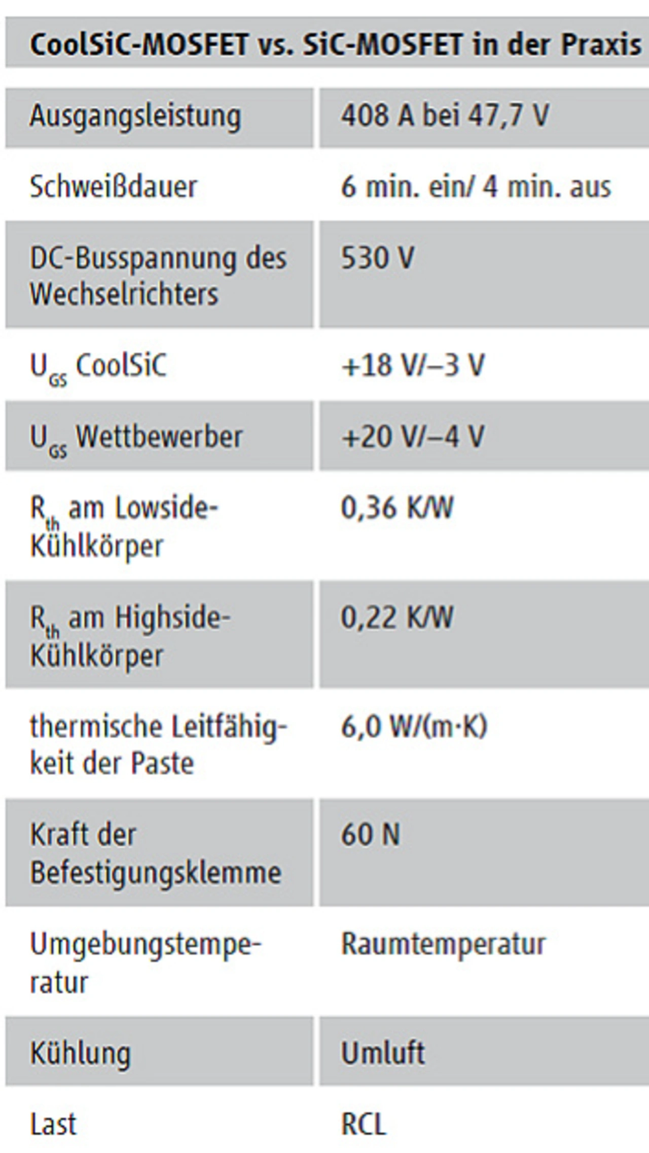 Infolgedessen erreichten die SiC-MOSFET-Bauelemente mit einer Schweißdauer von 60 Prozent bei maximaler Betriebsanforderung den thermischen Gleichgewichtszustand. Die Testbedingungen zeigt Tabelle 2.