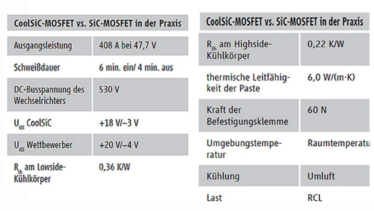 Die Stromversorgung des Schweißgeräts bestand aus einem dreiphasigen Vollbrücken-Wechselrichter mit vier CoolSiC-Bauteilen des Typs IMZA120R020M1H (1200 V/20 mΩ). Die grundlegenden Spezifikationen des Wechselrichters sind in Tabelle 1 aufgeführt. Um die Leistungsfähigkeit zu untersuchen, wurde dieser Wechselrichter auch mit einem SiC-MOSFET eines Mitbewerbers bestückt und unter den gleichen Testbedingungen verglichen.