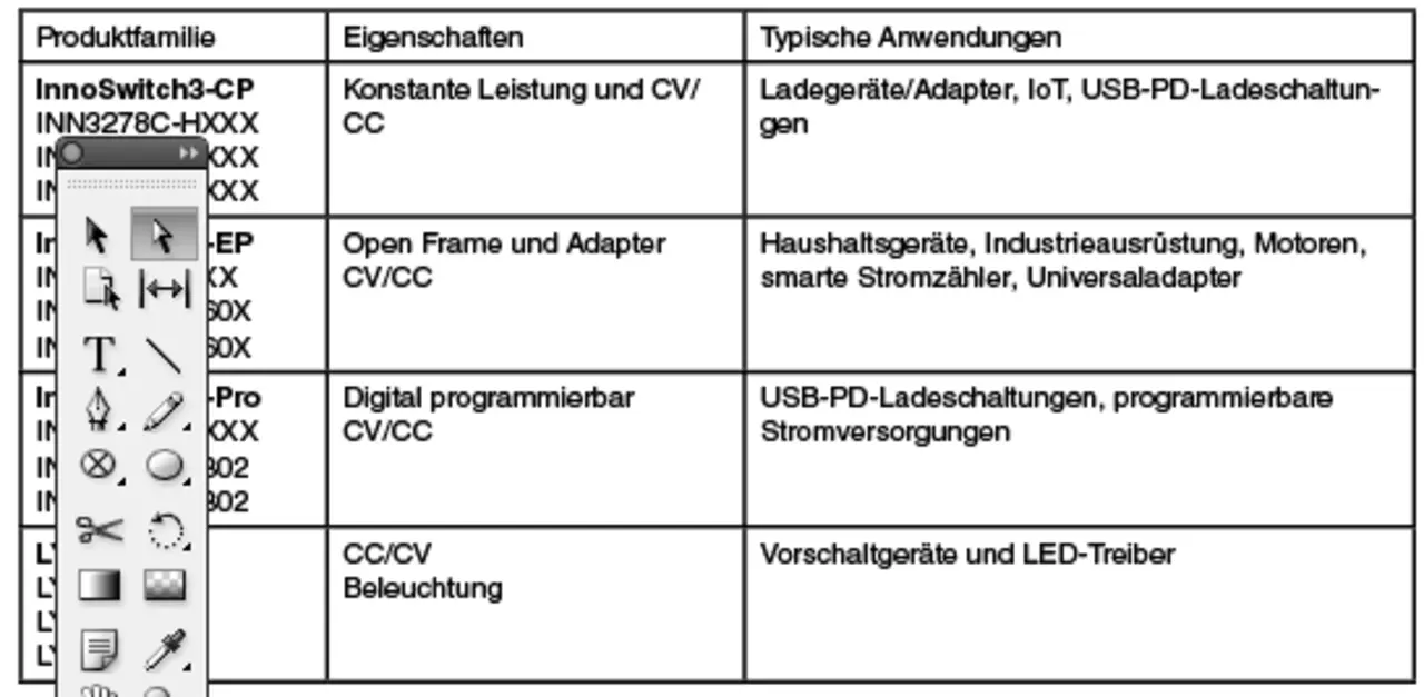 Power Integrations verwendet zur Einordnung von ICs innerhalb ihrer jeweiligen Produktfamilie ein informatives Bezeichnungsschema: Alle ICs der nachfolgend aufgelisteten Familien, deren letzte Ziffer eine 9 oder 0 ist, enthalten PowiGaN-basierte Schalter. Das Gleiche gilt für Produkte, deren Bezeichnung auf 78 endet. ICs, deren Bezeichnung auf 68 endet, enthalten Siliziumschalter mit einer VDS(MAX) von 650 V.