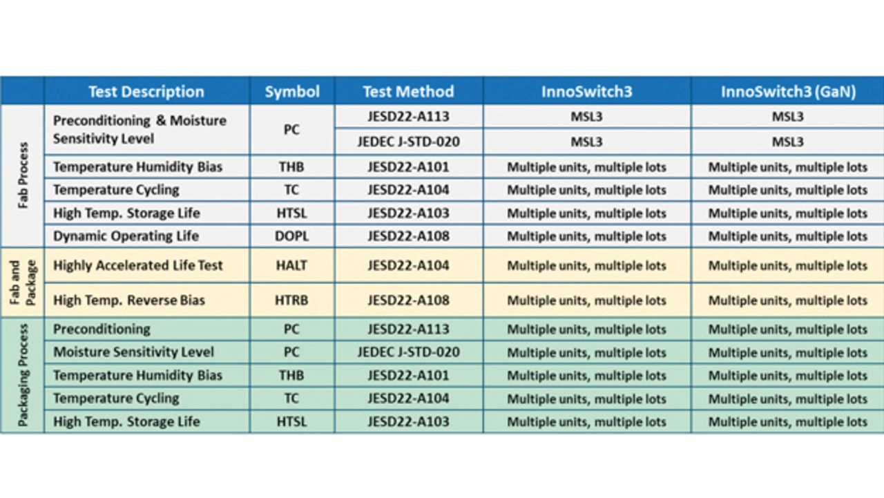 PowiGaN-ICs wurden für die bei Off-line-Sperrwandlern üblichen Spannungsbereiche optimiert. Sie werden in den gleichen Fabriken gefertigt wie die herkömmlichen Siliziumprodukte von Power Integrations und wurden umfassenden Qualifizierungstests unterzogen, um einen zuverlässigen Betrieb in Spannungswandlerschaltungen zu gewährleisten. Zusätzlich zu den unten aufgelisteten Qualifizierungstests durchlaufen die Schalter-ICs von Power Integrations umfangreiche Langzeittests in realen Stromversorgungsschaltungen. Dank dieser Maßnahmen weisen alle Produkte eine sehr geringe Feldausfallrate von weniger als 0,2 ppm auf.
