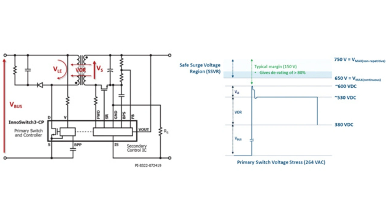 Schalterprodukte von Power Integrations sind mit allen Netzspannungen weltweit kompatibel und decken dadurch nahezu alle denkbaren Off-line-Spannungswandleranwendungen ab. Der Spannungsstress auf der Primärseite einer Sperrwandler-Stromversorgung setzt sich aus der gleichgerichteten Netzspannung (VBUS) und der reflektierten Ausgangsspannung (VOR) zusammen. Letztere ist vom Übersetzungsverhältnis des Transformators und der durch die Streuinduktivität der Primärwicklung induzierten Spannung (VLE) abhängig. Bei einer typischen Sperrwandlerschaltung tritt der Worst-Case-Spannungsstress unter normalen Betriebsbedingungen bei der maximalen Netzspannung auf (in Europa 264 V AC). Bild 7 zeigt die ungefähren Amplituden der verschiedenen Stresskomponenten im Vergleich zur Sperrspannung eines primärseitigen PowiGaN-Schalters.