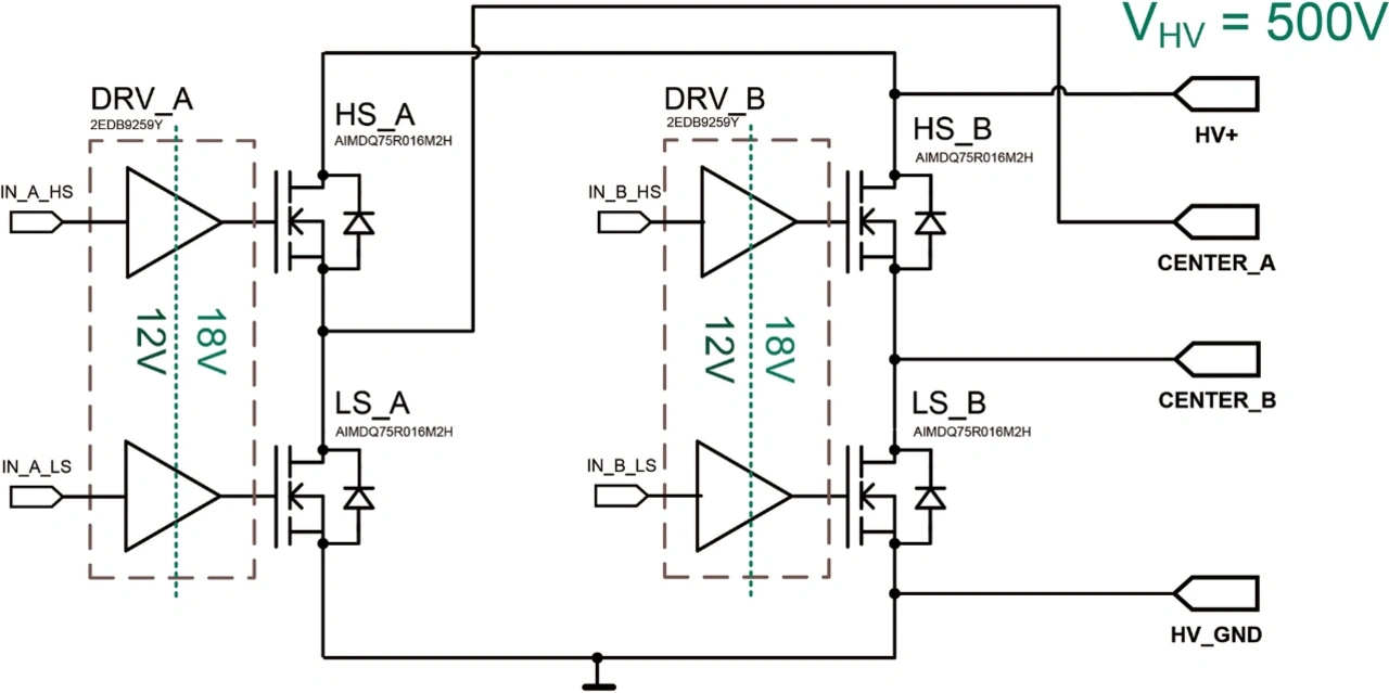 Das Evaluierungsboard umfasst eine Vollbrücke, wobei jede Halbbrücke über einen eigenen MOSFET-Treiber auf der Unterseite der Leiterplatte verfügt (Bild 2). Mit den ausgewählten MOSFETs ist eine Abschaltung bei 0 V möglich, sodass über den Zweikanal-Treiber 2EDB9259Y eine Gate-Ansteuerspannung von +18 V und 0 V verwendet wurde. Zudem bietet der Treiber eine Unterspannungsabschaltung (Undervoltage Lockout; UVLO) von 15 V, zwei vollständig isolierte Kanäle mit kurzen Ausbreitungsverzögerungen, einen Durchschlussschutz und ein hohes Gleichtaktunterdrückungsverhältnis (Common-mode Rejection Ratio; CMMR), was für die schnelle dv/dt dieser WBG-Bauteile von Vorteil ist.