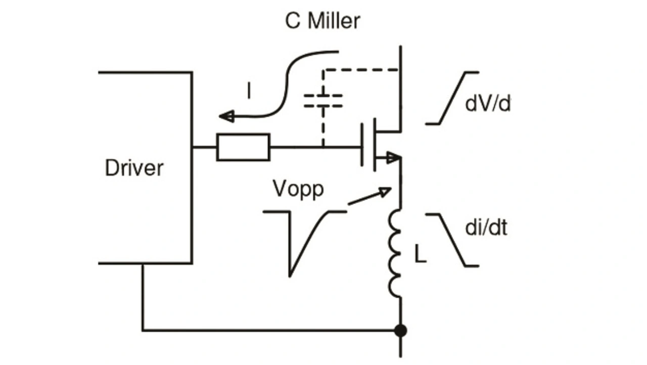 Theoretisch sind GaN-Bauelemente mit einer Gate-Source-Spannung UGS von 0 V sicher ausgeschaltet, aber in der Realität können selbst die besten Gate-Treiber keine 0 V direkt an das Gate anlegen. Jede Serieninduktivität L in der Source-Leitung, die dem Gate-Treiberkreis gemeinsam ist, erzeugt eine Gegenspannung UOPP zum Gate-Treiber, die parasitäres Einschalten gemäß UOPP = –L ∙ di/dt verursacht (Bild 1). Der gleiche Effekt lässt sich beim Ausschalten durch ein hohes du/dt verursachen, wenn der Strom durch die Miller-Kapazität des Bausteins fließt. Für GaN-HEMTs lässt sich dieser Effekt jedoch vernachlässigen.