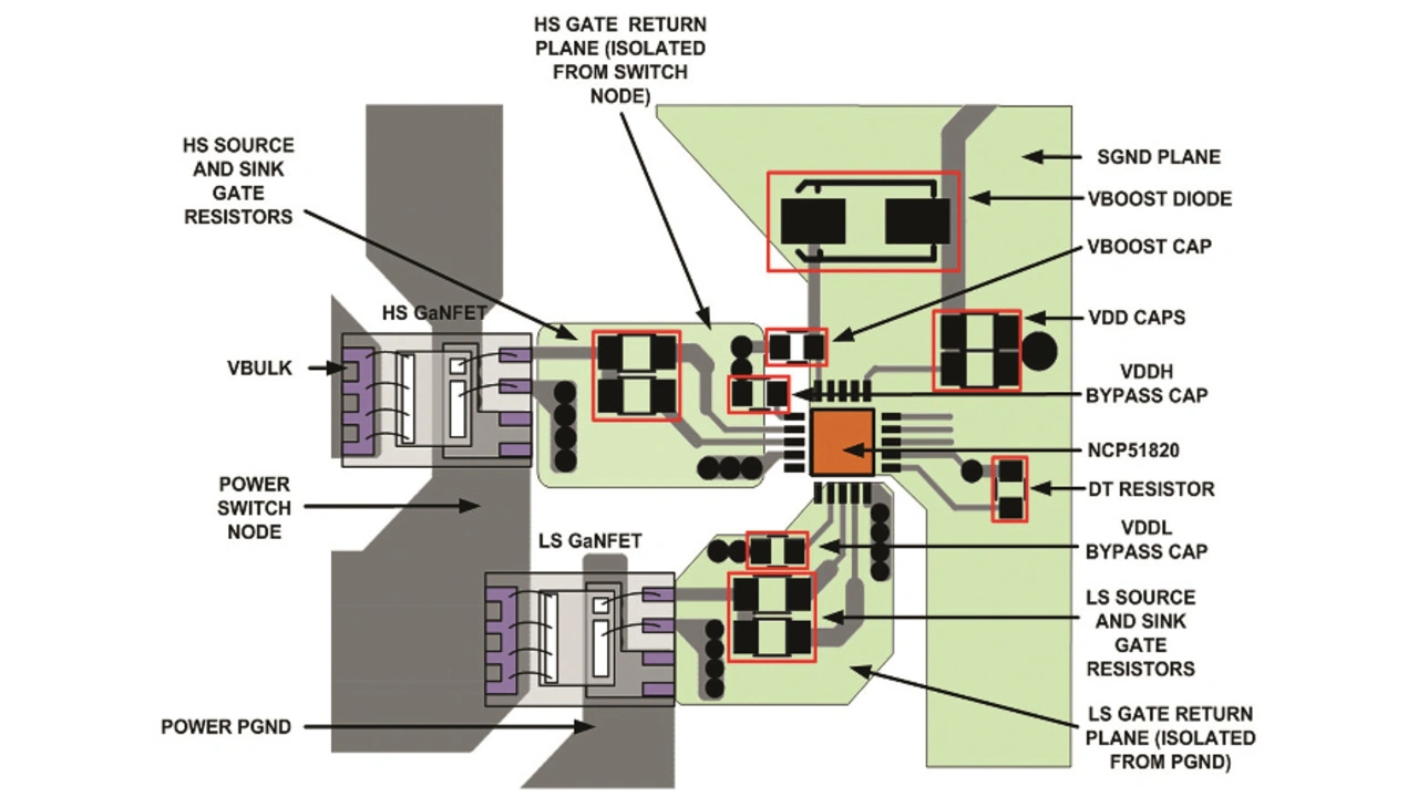 In allen Anwendungen ist das Board-Layout entscheidend für den Erfolg. Bild 4 zeigt ein Beispiellayout mit dem NCP51820, wo der Gate-Treiberkreis minimiert und angepasst ist. GaN-Bauelemente und Treiber befinden sich auf derselben Seite des Boards, um einen hohen Strom durch Durchkontaktierungen (Vias) bei entsprechenden Masse- und Rückführungsebenen zu vermeiden.