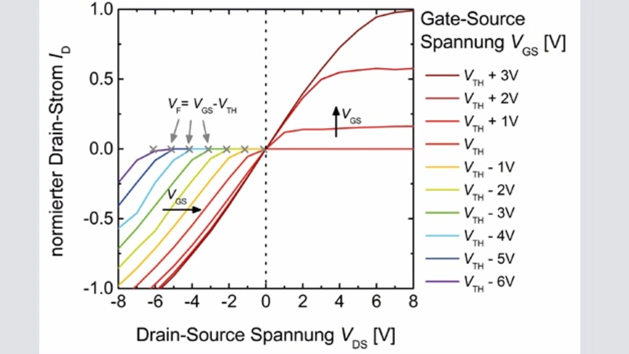 Vereinfacht kann man einen GaN-Transistor bei kleineren Spannungen als bidirektionales Bauelement ansehen. Damit gilt die Gate-Schwellspannung nicht nur zwischen Gate und Source, sondern auch zwischen Gate und Drain. Das heißt, auch wenn die Gate-Drain-Spannung größer wird als die Gate-Schwellspannung, wird das Bauelement leitend. Bei negativen Drain-Source Spannungen lässt sich dieser Zustand leicht erreichen.